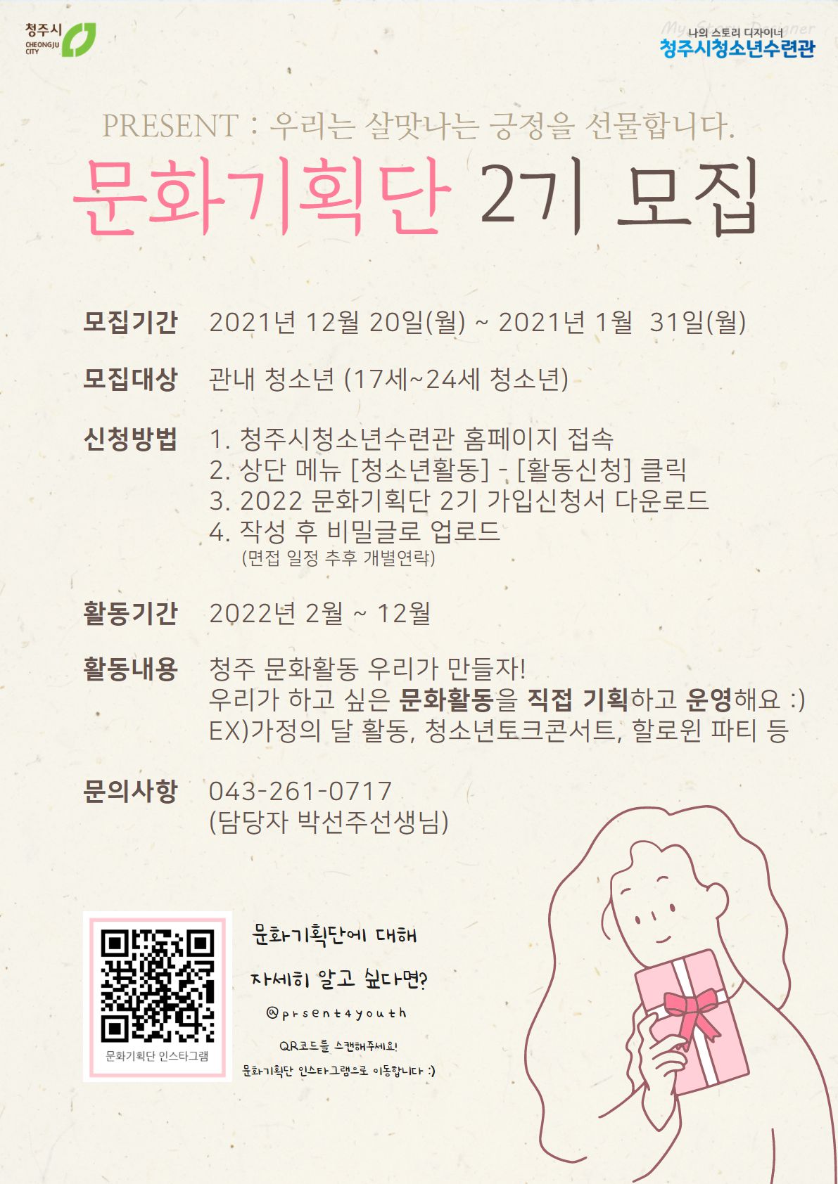 1기 활동했던 단원들의 후기가 궁금하다면 문화기획단 인스타그램(@present4youth)을 확인해주세요 :)