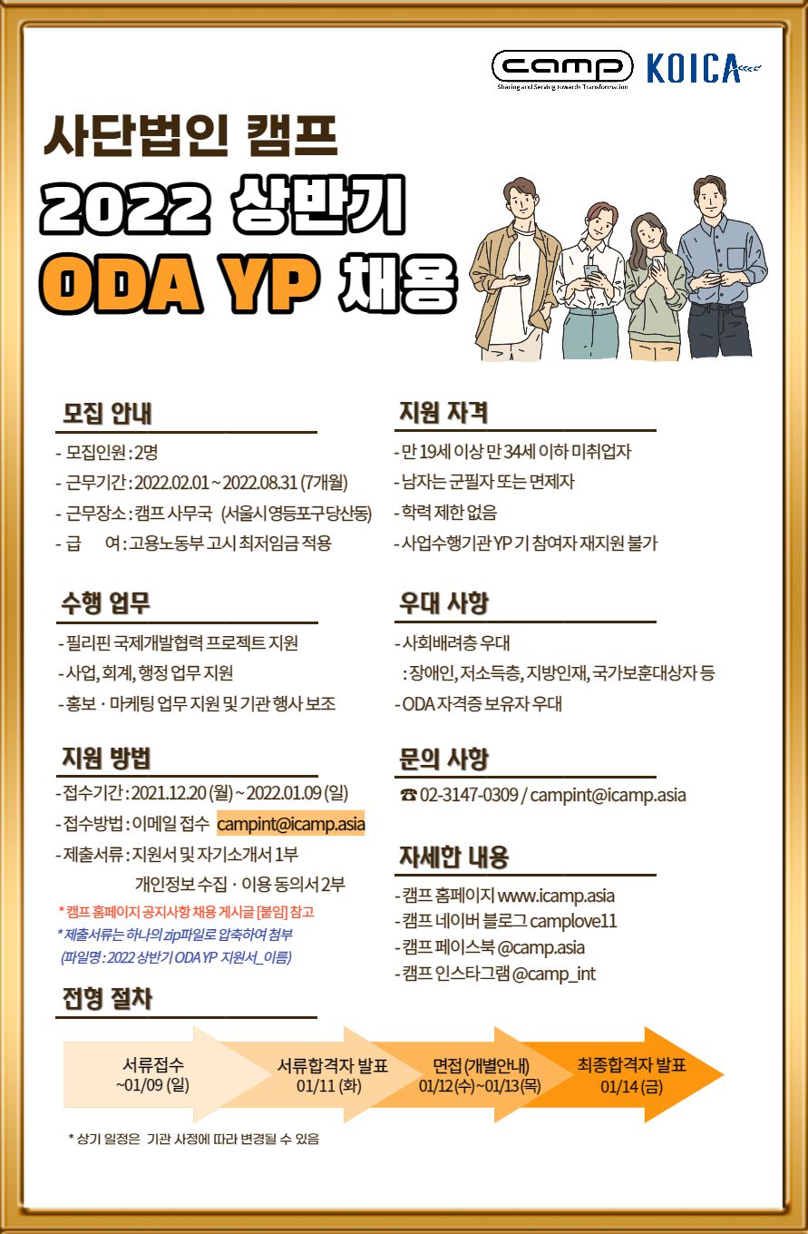 º 지원서, 자기소개서, 개인정보 수집·이용 동의서 작성 후 이메일(campint@icamp.asia) 통해 개별 접수(~01/09, 24:00까지) (파일명 : 2022 상반기 ODA YP 지원서_이름)