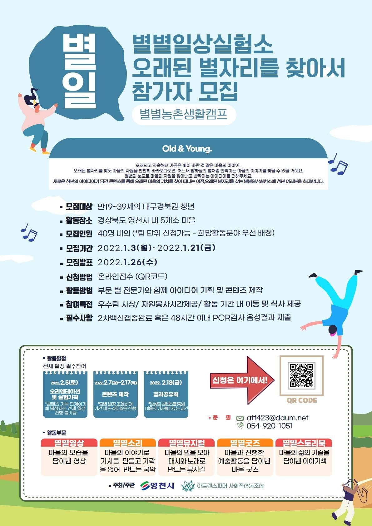 ■활동컨셉 : Old & Young. 오래되고 익숙해져 가끔은 빛이 바란 것 같은 마을의 이야기. 오래된 별자리를 찾듯 마을의 자원을 찬찬히 바라보다보면 어느새 밤하늘의 별처럼 반짝이는 마을의 이야기를 찾을 수 있을 거예요. 청년의 눈으로 마을의 자원을 찾아내고 반짝이는 아이디어를 더해주세요 . 새로운 청년의 아이디어가 담긴 콘텐츠를 통해 오래된 마을의 가치를 찾아 떠나는 여정, 오래된 별자리를 찾는 별별일상실험소에 청년 여러분을 초대합니다.