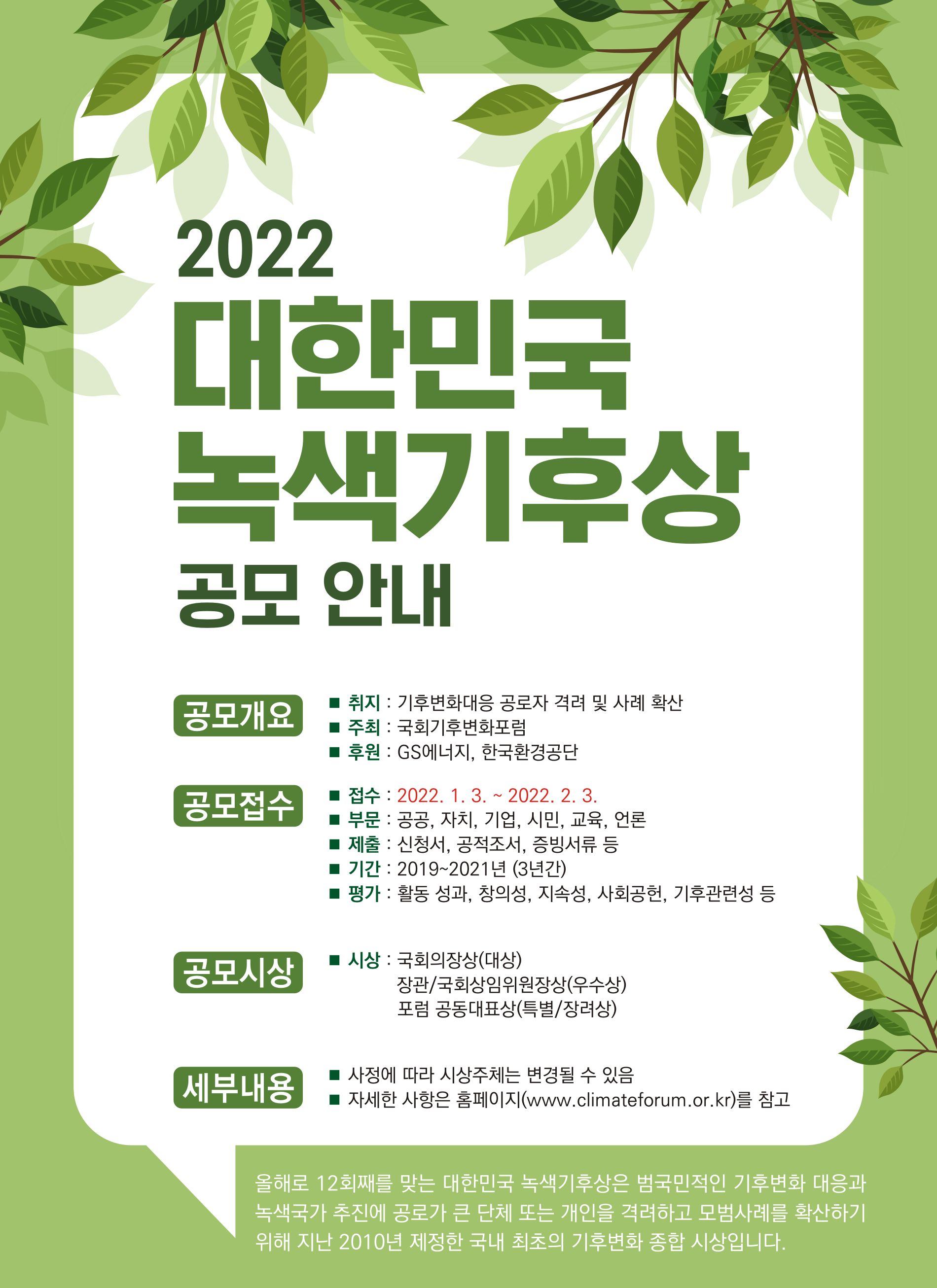 : 올해로 12회째 맞이하는 기후변화 종합 시상으로 범국민적 기후변화 대응과 녹색국가 추진을 위해 공로가 큰 단체 및 개인의 활동을 시상함으로써 그들의 노력을 격려하고 모범 사례를 확산하기 위함.