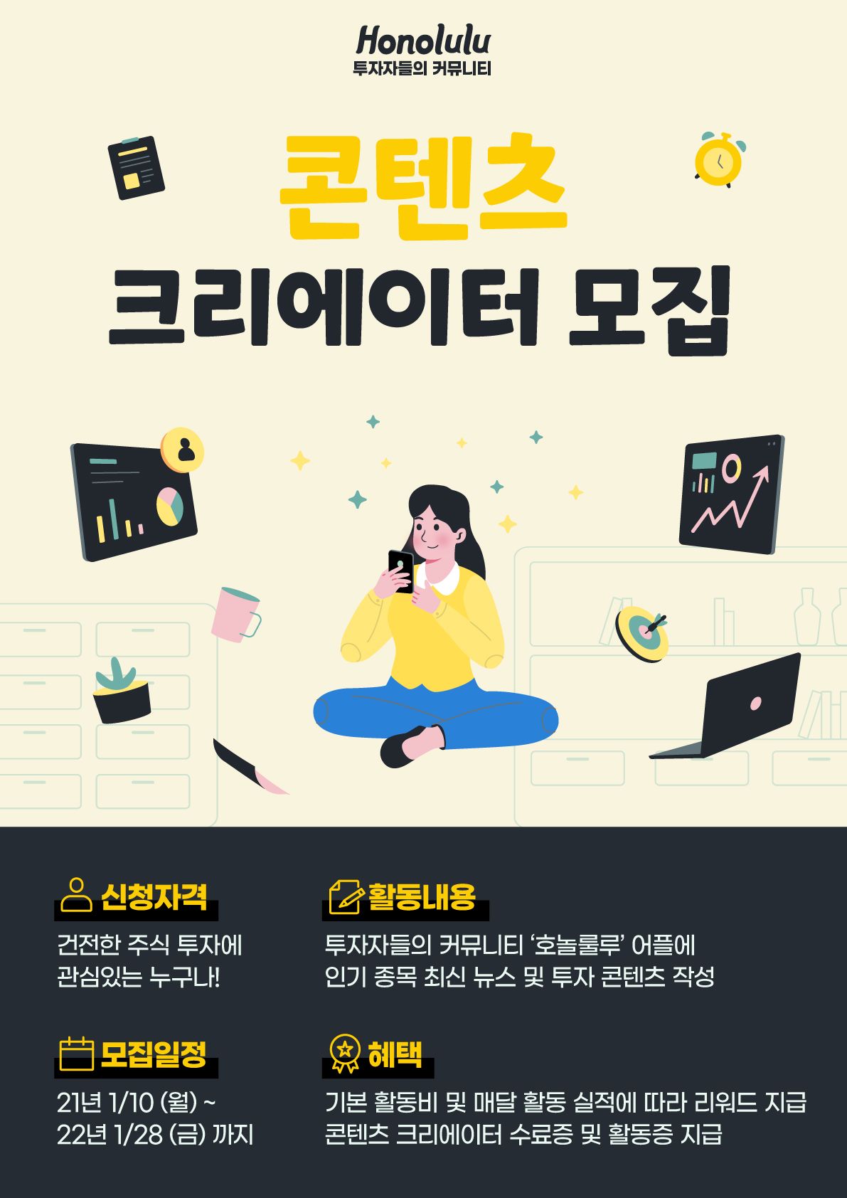 투자자들의 커뮤니티 '호놀룰루'에서 콘텐츠 크리에이터를 모집합니다!