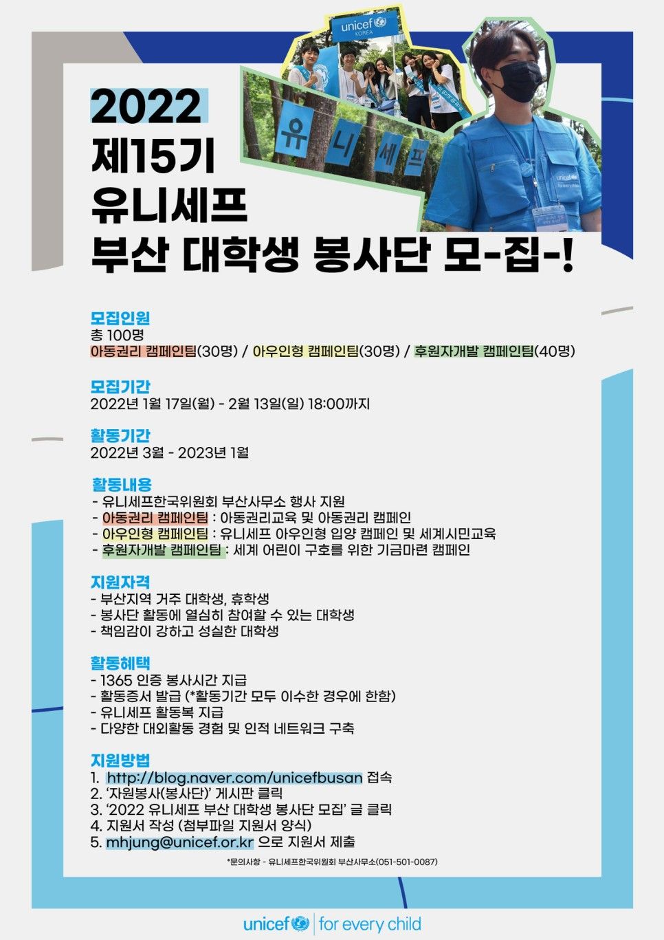 2022년도 유니세프와 함께할 부산 대학생 봉사단을 모집합니다!