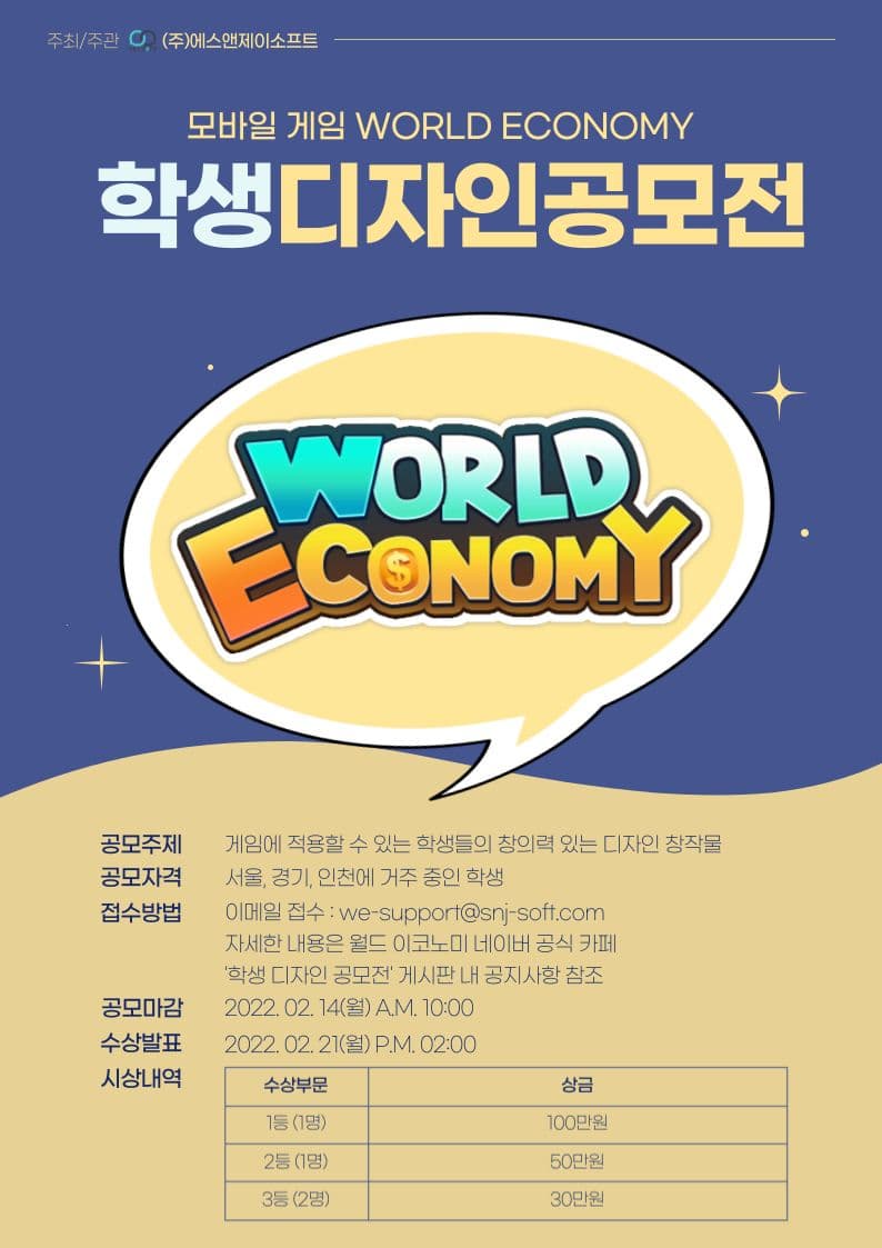 (주)에스앤제이소프트는 "월드 이코노미 학생 디자인 공모전"을 통해 게임 산업 발전과 숨겨진 인재 채용 기회의 장을 열고자 합니다.