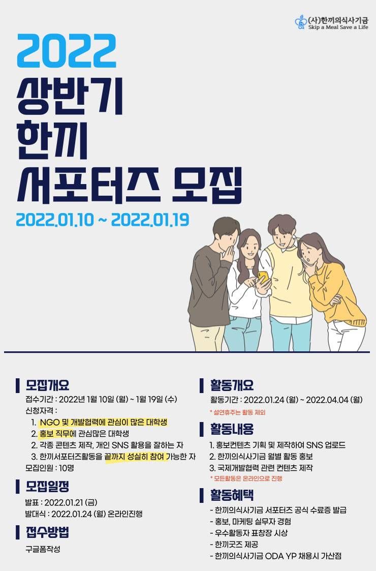 부산유일 국제구호단체 한끼의식사기금에서 2022상반기를 함께할 온라인 서포터즈를 모집합니다!