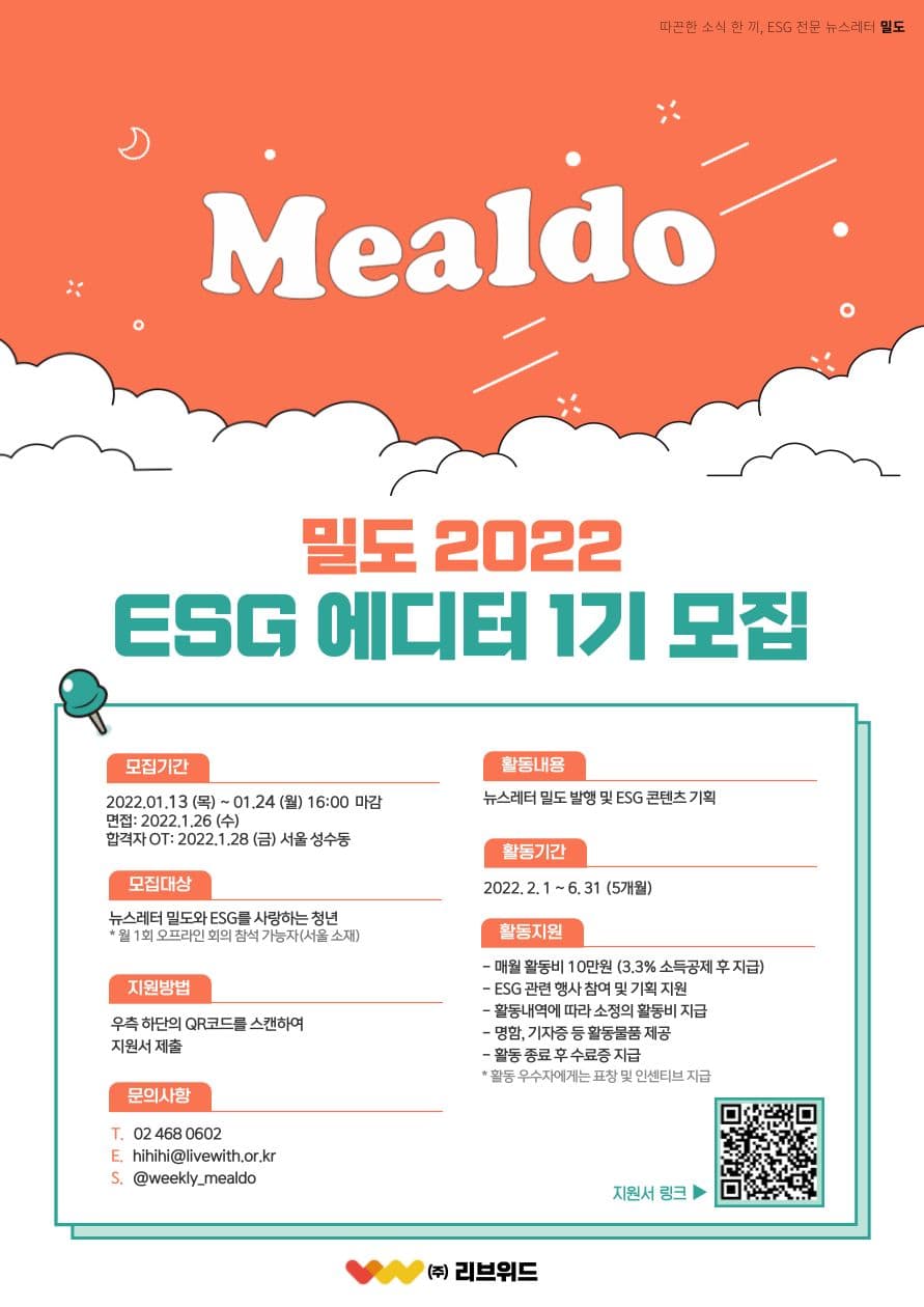 ESG 전문 뉴스레터 밀도에서 함께 뉴스레터와 콘텐츠를 발행하고 기획할 ESG 에디터 1기를 모집합니다. 관심 있는 주제로 글을 쓰고, 기업과의 협업을 기획하는 등 제약 없는 다양한 활동이 가능합니다. ESG와 CSR로 더 나은 세상을 만들고 싶은 분들을 기다립니다.