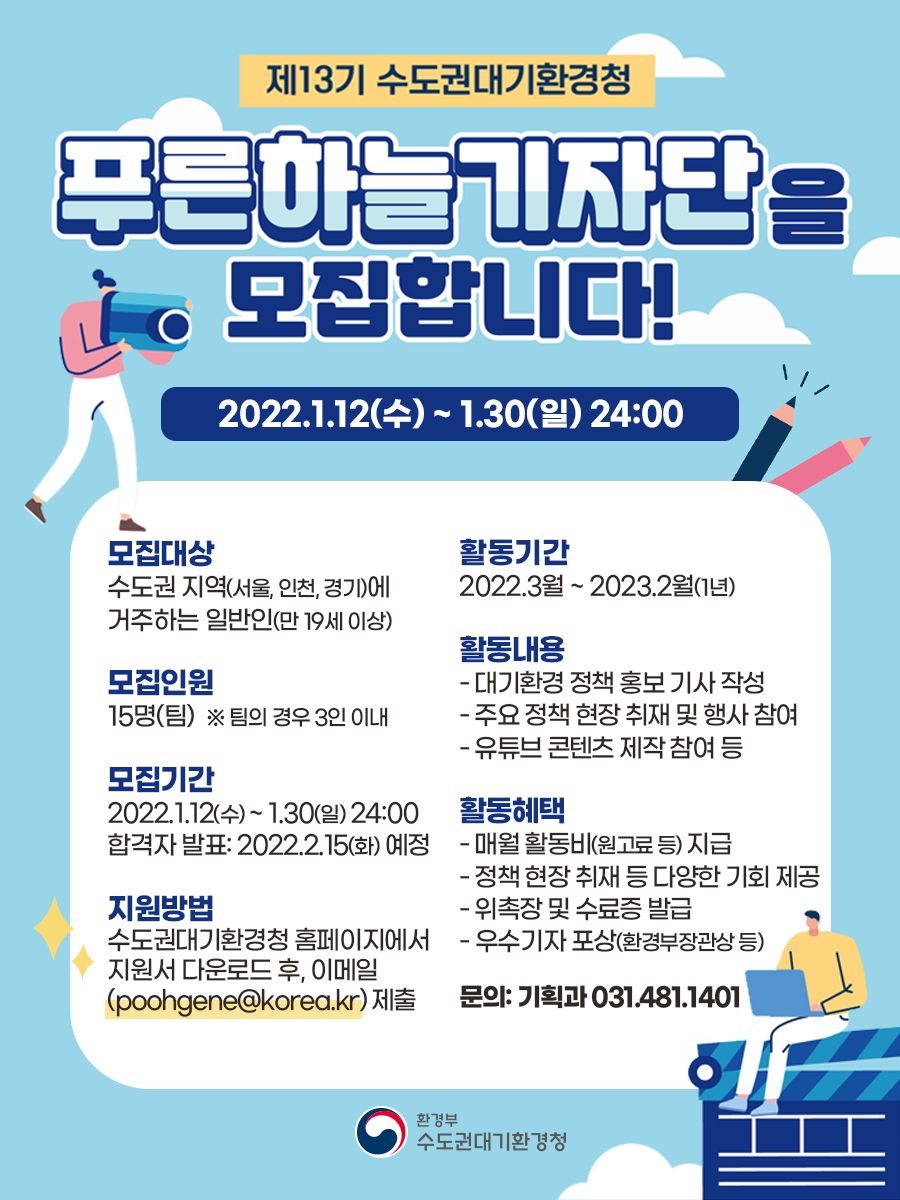 [환경부 수도권대기환경청] 제13기 푸른하늘기자단 모집!
