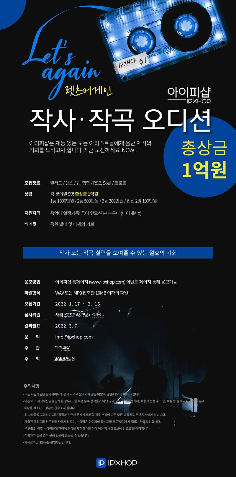 - 제출된 곡의 저작권은 창작자에게 있으며, 수상작은 아이피샵 앨범 제작 프로젝트에 사용되는 것을 확인합니다.
