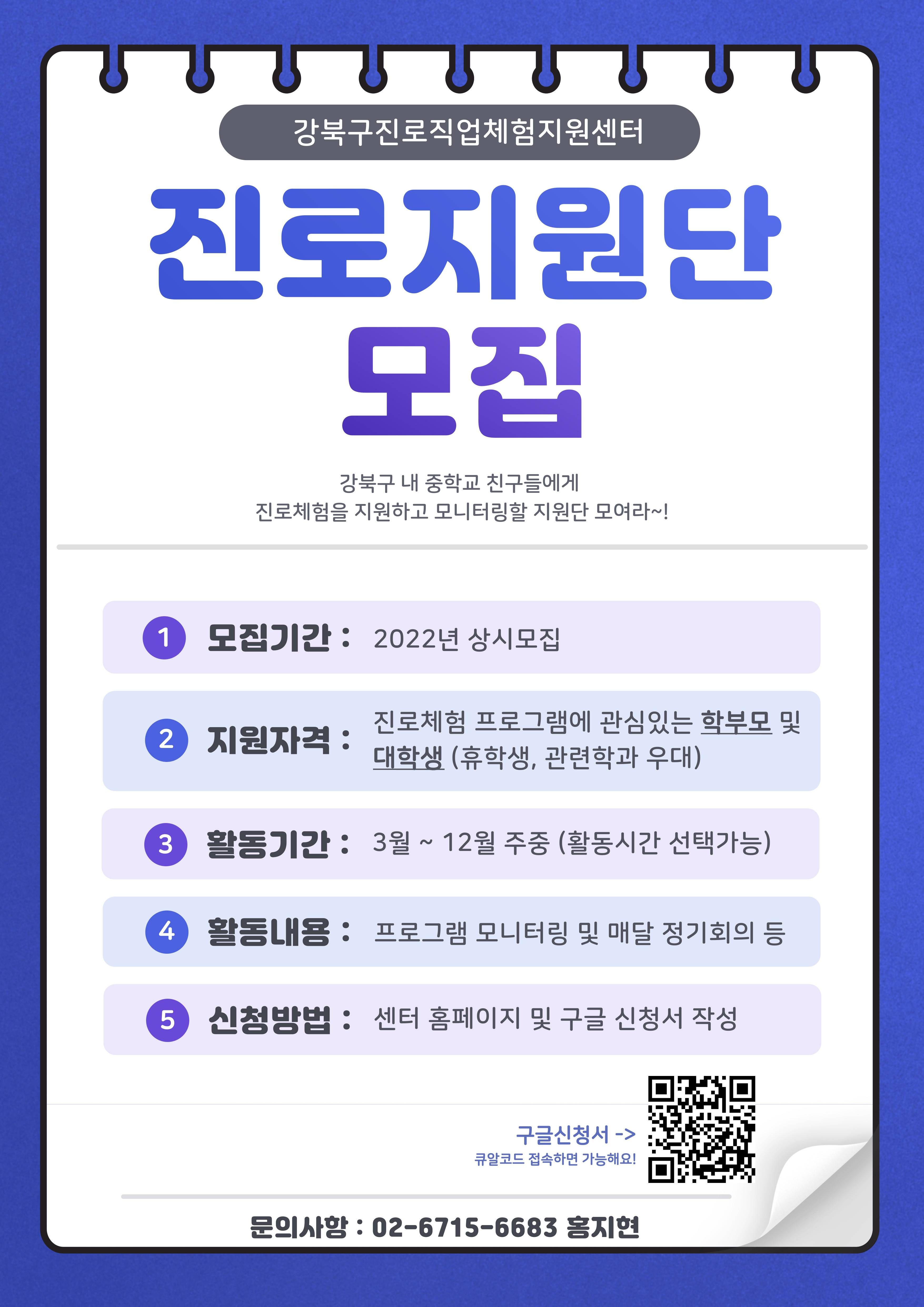 강북진로센터에서 청소년의 진로 및 직업체험에 관심있는 학부모 및 대학생 지원단을 모집합니다.