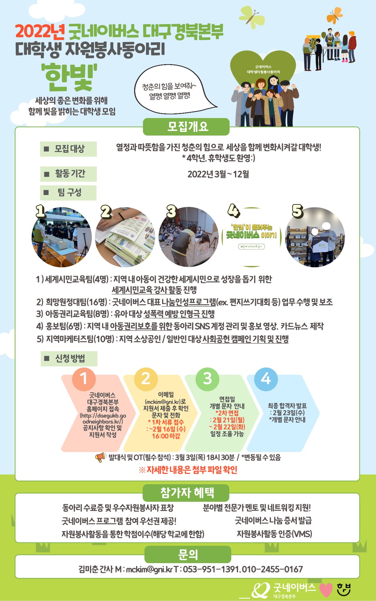 2) 희망원정대팀(16명) : 굿네이버스 대표 나눔인성프로그램(ex.편지쓰기대회 등) 업무 수행 및 보조