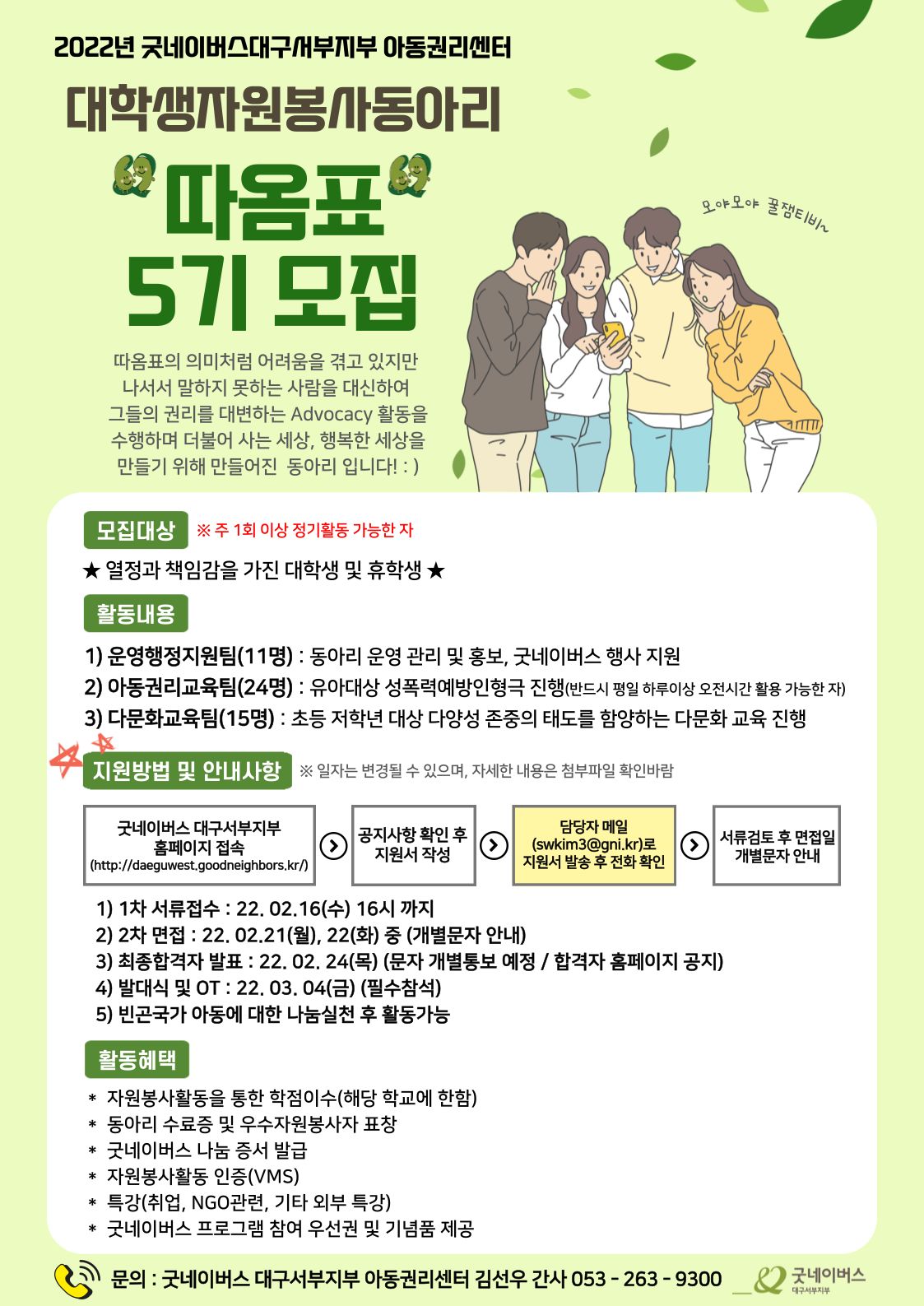 ▶ 문 의 : 굿네이버스 대구서부지부 아동권리센터 김선우 간사 (☎053-263-9300)
