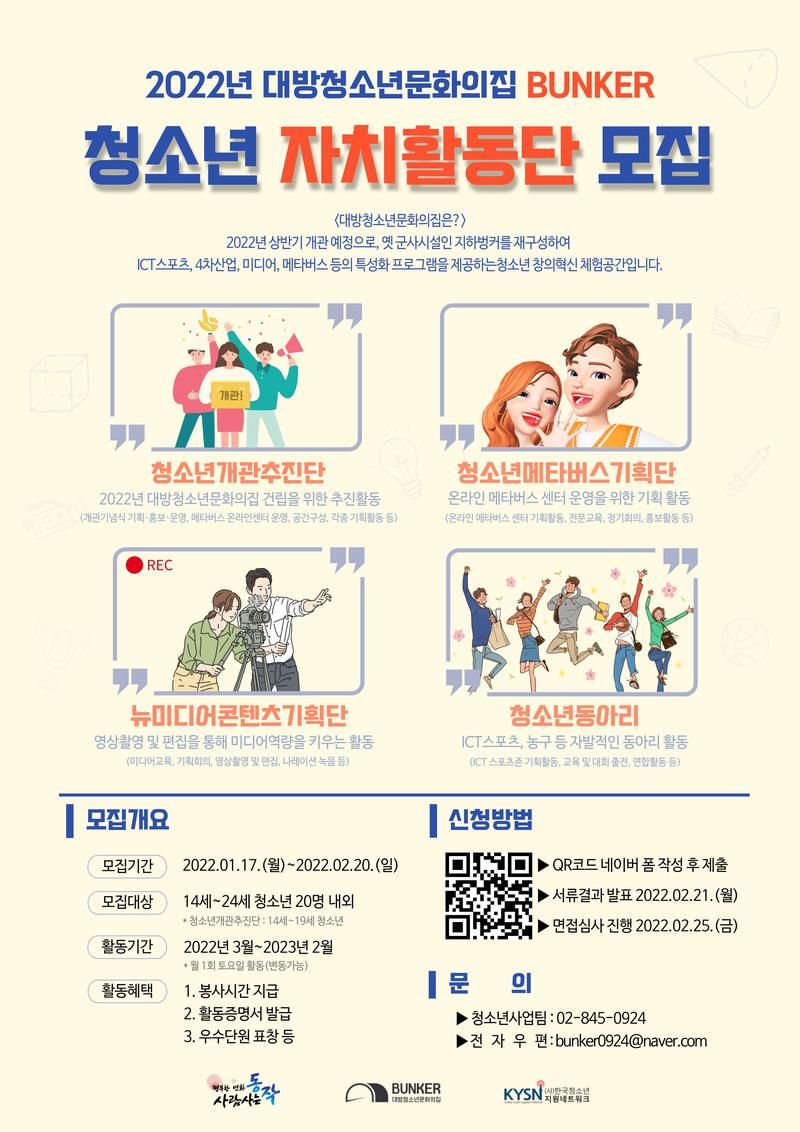 2022년 대방청소년문화의집 '벙커' 청소년 자치활동단의 신규 단원을 모집합니다 🤗