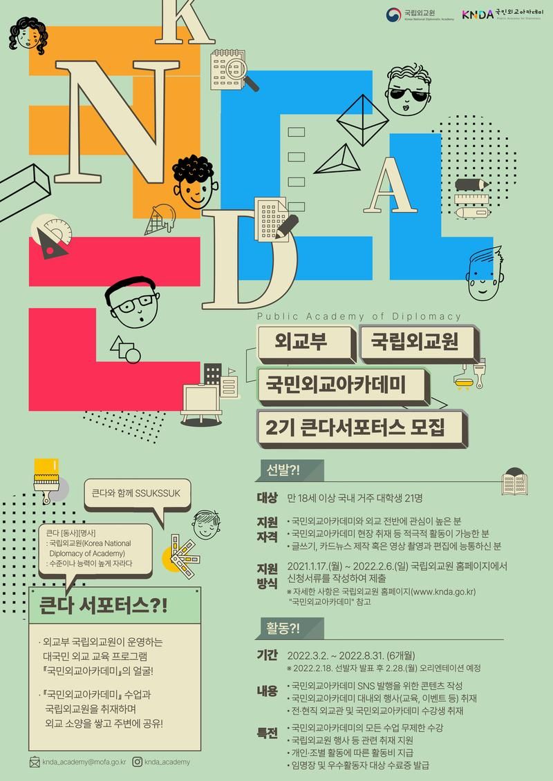 외교부 국립외교원이 운영하는 외교 교육 프로그램 "국민외교아카데미"의 수업을 취재하고 국립외교원과 국민외교아카데미를 홍보할 대학생 서포터스를 모집합니다. 외교와 정치에 관심을 갖고 있어 소양을 쌓고자 하시는 분, 영상 제작과 기사 발행에 자신이 있으신 분, 취재 열정을 갖고 있으신 모든 분들을 환영합니다.