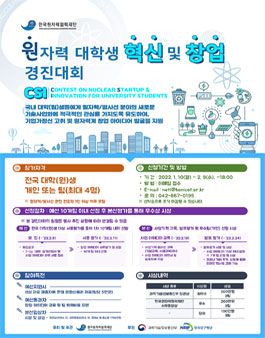 한국원자력협력재단은 국내 대학(원)생을 대상으로 원자력 대학생 혁신 및 창업 경진대회의 참가팀을 모집하오니 원자력/방사선 분야의 창업에 관심있는 대학(원)생들의 많은 신청 바랍니다.