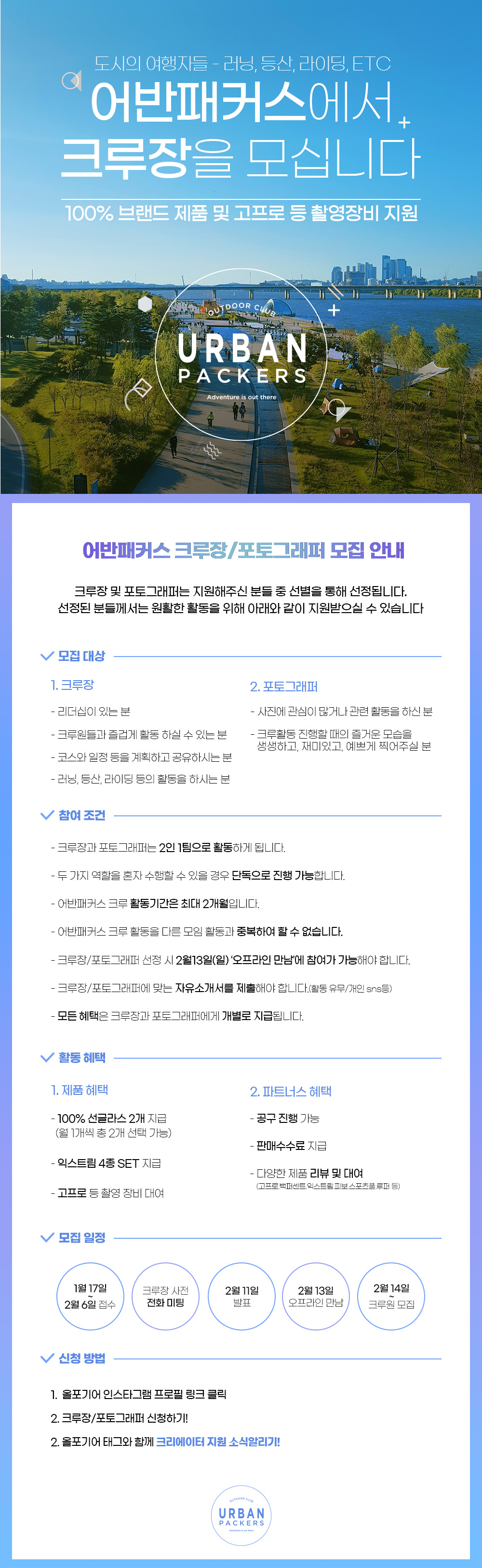 - 어반패커스 크루 활동을 다른 모임 활동과 중복하여 할 수 없습니다.