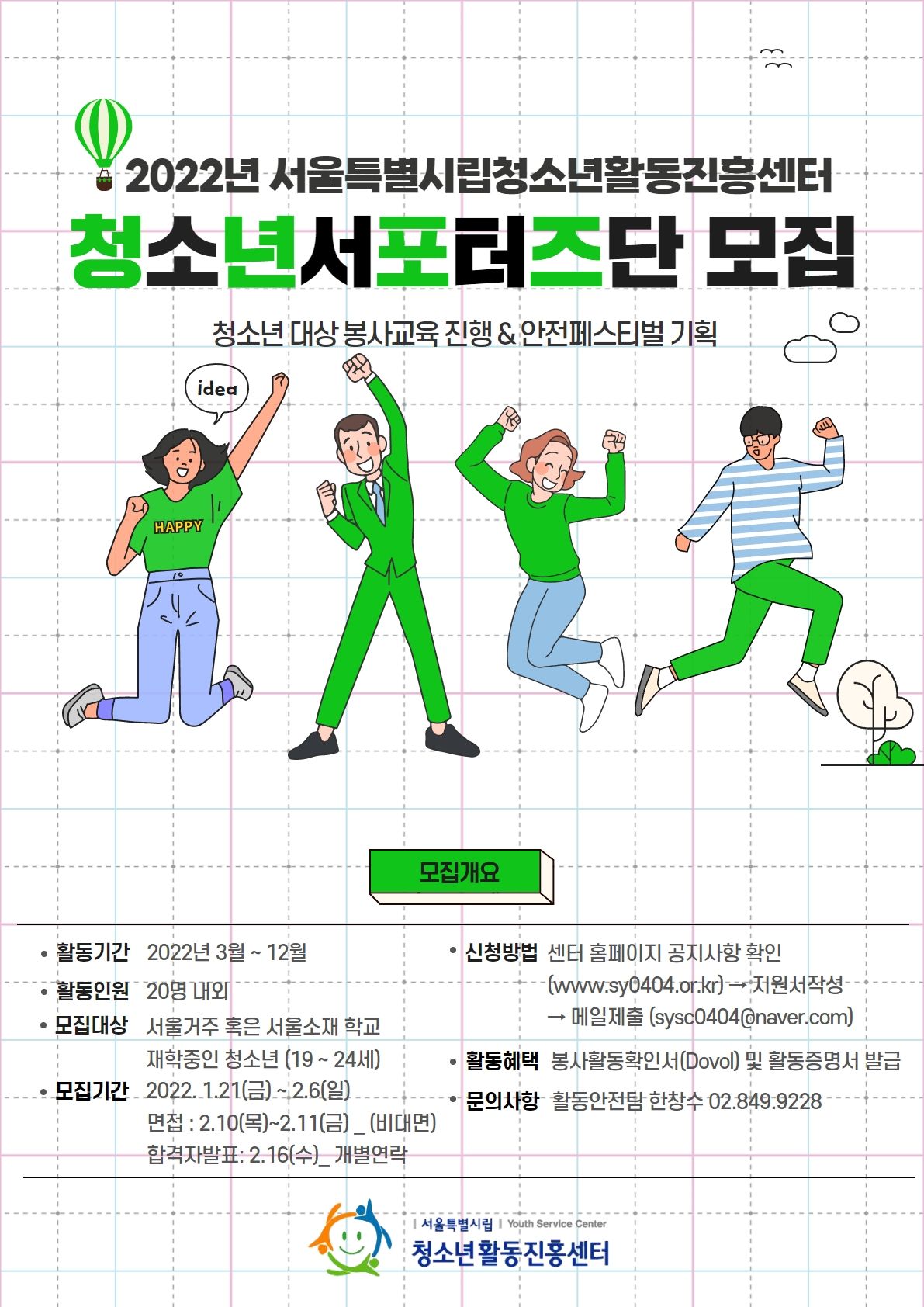 서울특별시립청소년활동진흥센터는 청소년활동 진흥법 제7조에 의거하여 청소년의 건강한 성장을 위해 서울지역의 청소년시설과 소통·협력·지원·혁신을 통해 청소년활동 정책을 지원하는 청소년정책 수행기관입니다. 서울지역 후기 청소년의 자기주도적인 봉사활동 참여를 통한 가치성장 및 자기개발의 기회 제공을 위하여『2022년 청소년 서포터즈단』을 모집하여 운영하고자 하오니 서울거주 또는 서울 소재 학교 재학 중인 청소년의 많은 관심과 참여부탁드립니다.