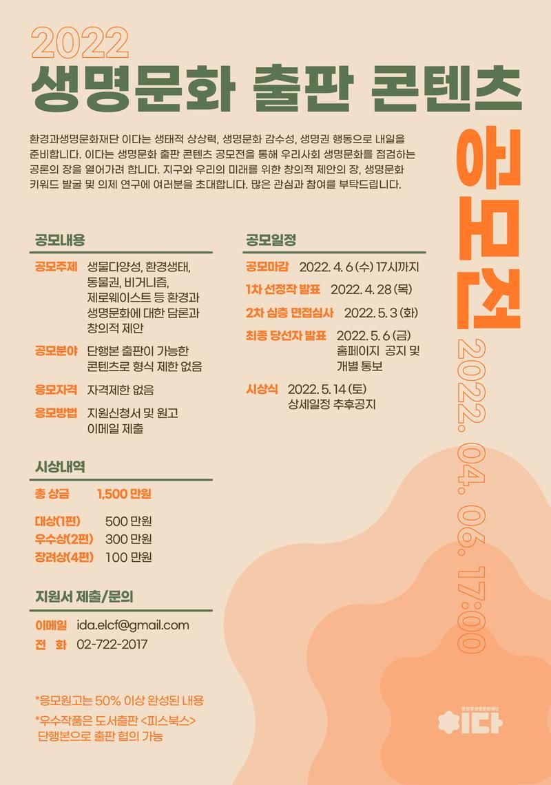 환경과생명문화재단 이다는 생태적 상상력, 생명문화 감수성, 생명권 행동으로 내일을 준비합니다. 이다는 생명문화 출판 콘텐츠 공모전을 통해 우리사회 생명문화를 점검하는 공론의 장을 열어가려 합니다. 지구와 우리의 미래를 위한 창의적 제안의 장, 생명문화 키워드 발굴 및 의제 연구에 여러분을 초대합니다. 많은 관심과 참여를 부탁드립니다.