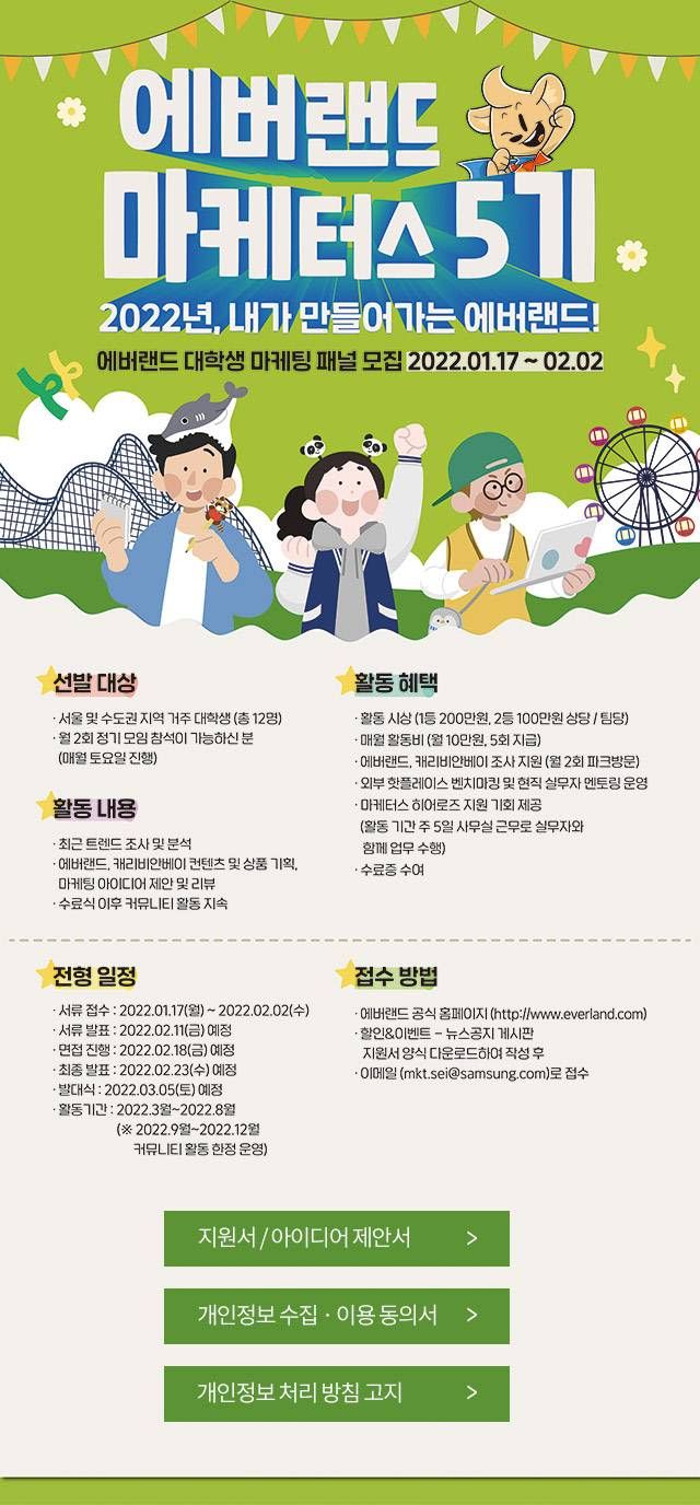 - 에버랜드 공식 홈페이지 할인&이벤트 - 뉴스공지 게시판 모집공고 확인 후 지원서 양식 다운로드하여 작성, 이메일(mkt.sei@samsung.com)로 접수