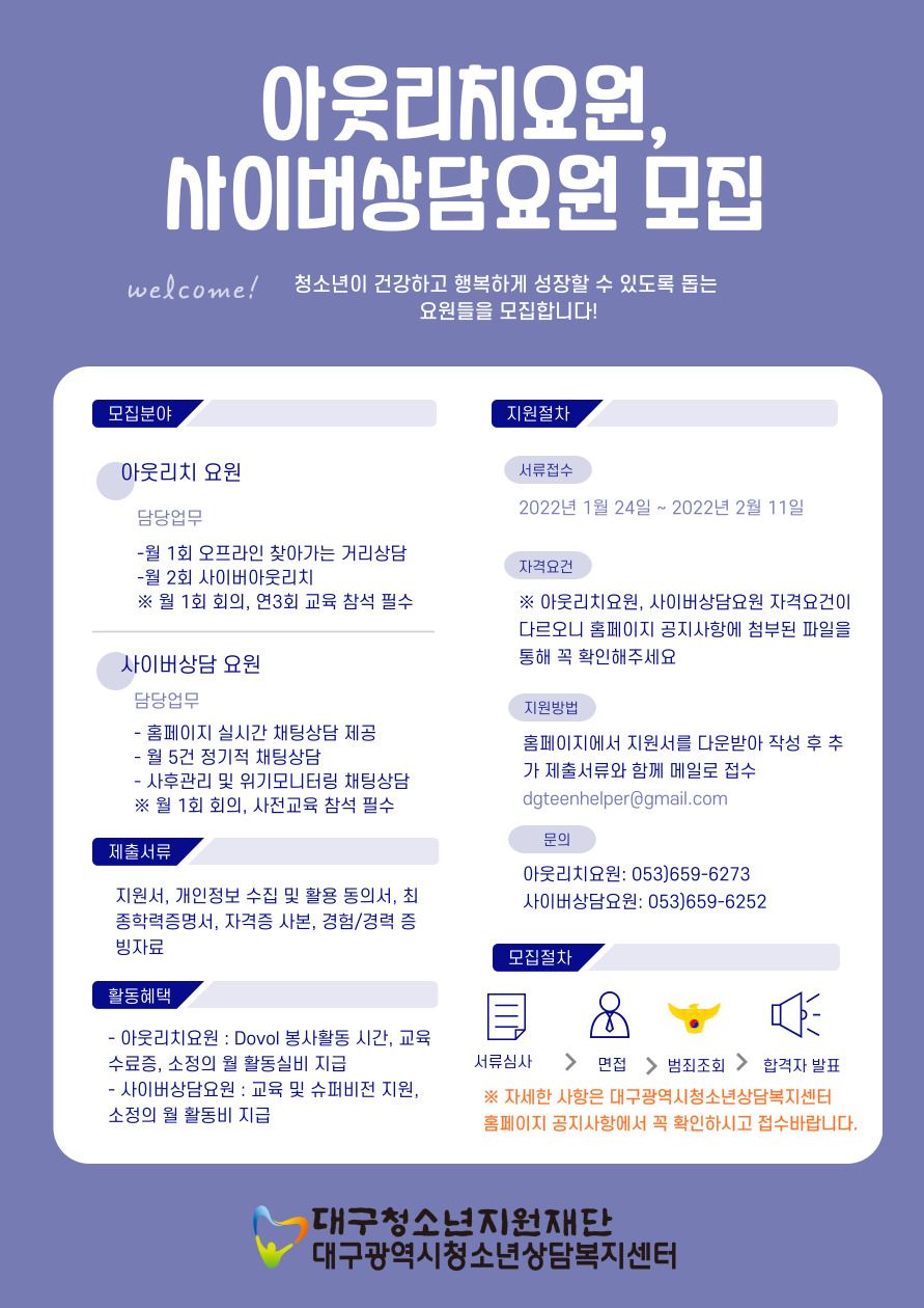 대구광역시청소년상담복지센터에서 청소년의 건강한 성장을 지원하고 필요한 지원서비스를 제공하기 위한 활동을 실시할 2022년 아웃리치 요원 및 사이버상담요원을 모집합니다.