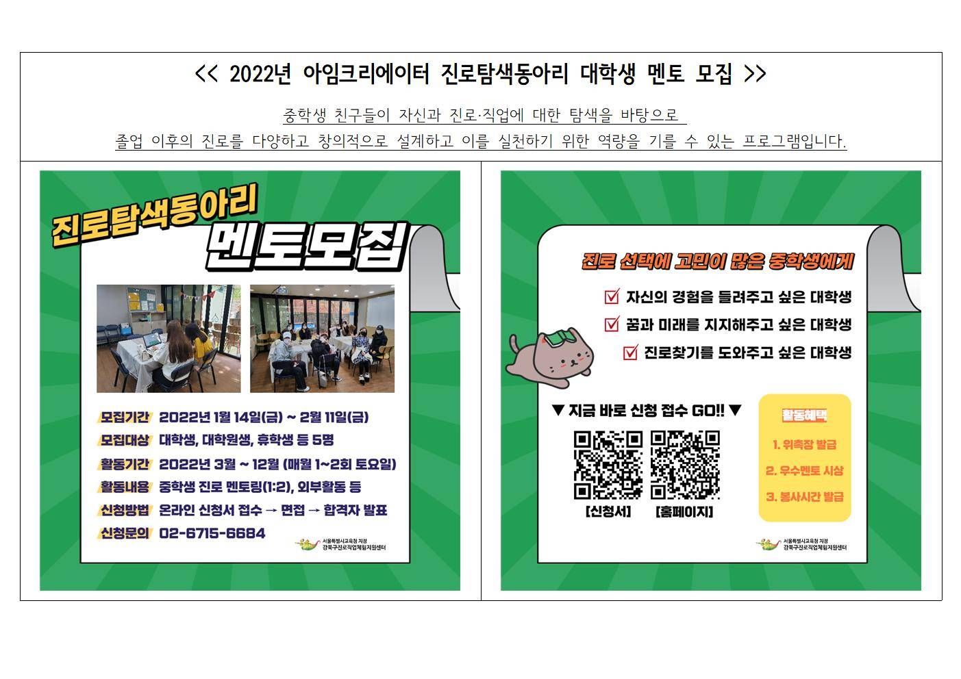 강북구진로직업체험지원센터 아임크리에이터 진로탐색동아리에 참여할 대학생 멘토님을 모집하고 있습니다.