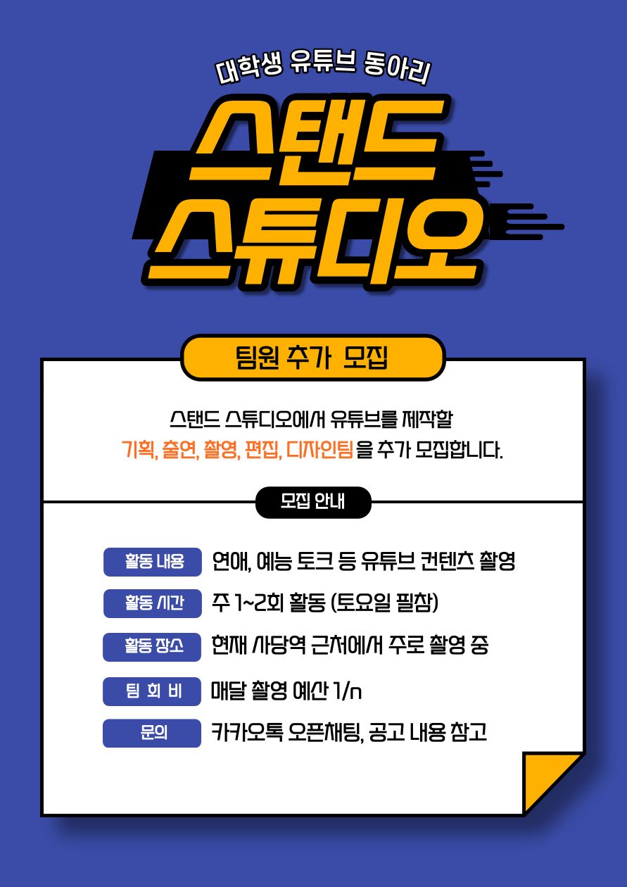 스탠드 스튜디오는 기획 및 홍보, 출연, 촬영, 편집까지 직접 진행하는 대학생 유튜브 영상 제작 동아리입니다. 매주 활발히 활동중으로 현재 주 2회 영상을 업로드 하고 있습니다. 더욱 활발한 영상 제작을 위해 추가적으로 팀원을 모집하며, 친목을 다지기 위한 목적이 아닌 열성적으로 영상 제작에 참여하실 분들을 기다립니다.