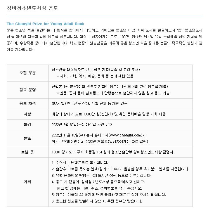 좋은 청소년 책을 출간하는 데 힘써온 창비에서 다양하고 의미있는 청소년 대상 기획 도서를 발굴하고자 ‘창비청소년도서상’을 마련해 다음과 같이 원고를 공모합니다. 대상 수상자에게는 고료 1,000만 원(선인세) 및 유럽 문화예술 탐방 기회를 제공하며, 수상작은 창비에서 출간합니다. 학교 현장의 선생님들을 비롯해 좋은 청소년 책을 꿈꿔온 분들의 적극적인 성원과 참여를 기다립니다.