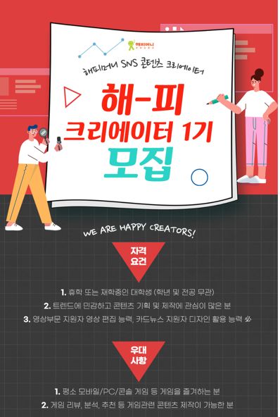 평소 해피머니 및 콘텐츠 제작에 관심이 있었던 분들이 있다면 지금 바로 <해피크리에이터1기>에 도전해보세요!
