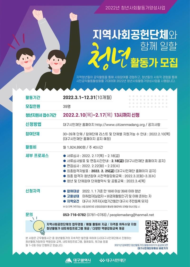 [대구시민재단] 2022년 청년사회활동가양성사업 (~02/17)