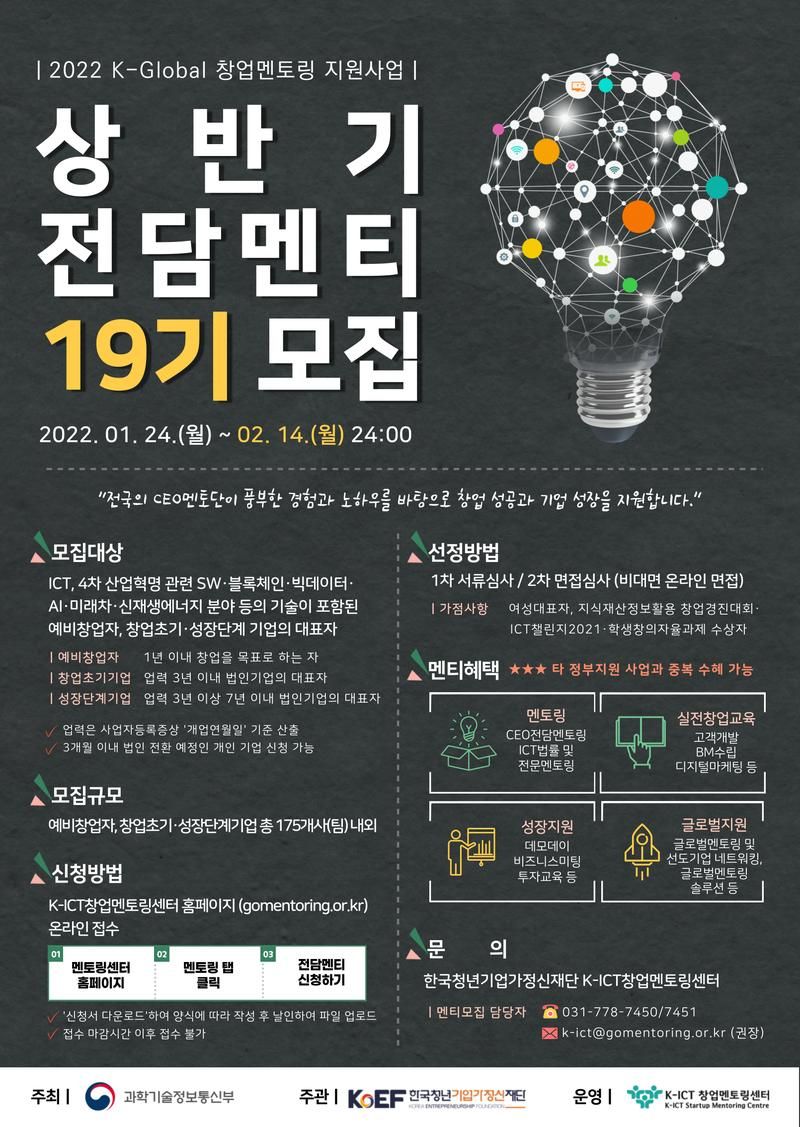 - 신청페이지 링크 : 멘토링 - K-ICT 창업멘토링센터 (gomentoring.or.kr)