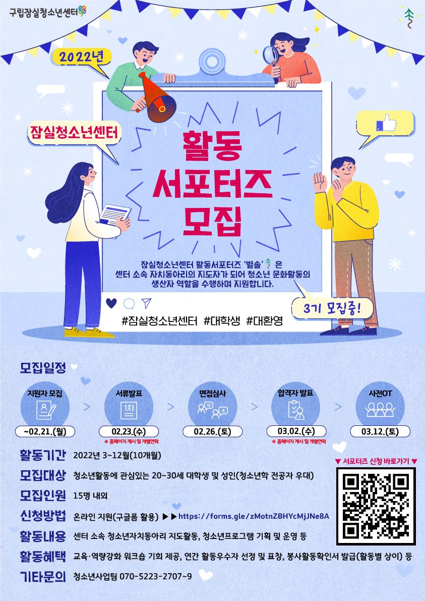 잠실청소년센터에서 2022년에 함께할 활동서포터즈 '별솔' 3기를 모집합니다!