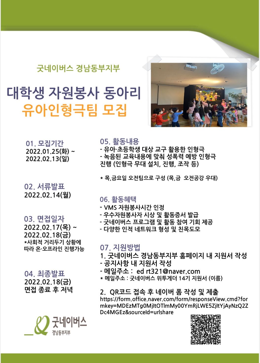 - 굿네이버스 및 NGO에 관심을 갖고 지속적으로 활동 가능한 성인