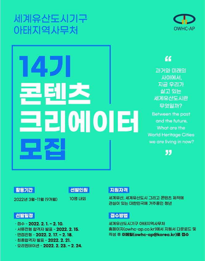- 세계유산, 세계유산도시 그리고 OWHC-AP 관련 사업, 활동, 행사 전반에 대한 콘텐츠 기획 및 생산