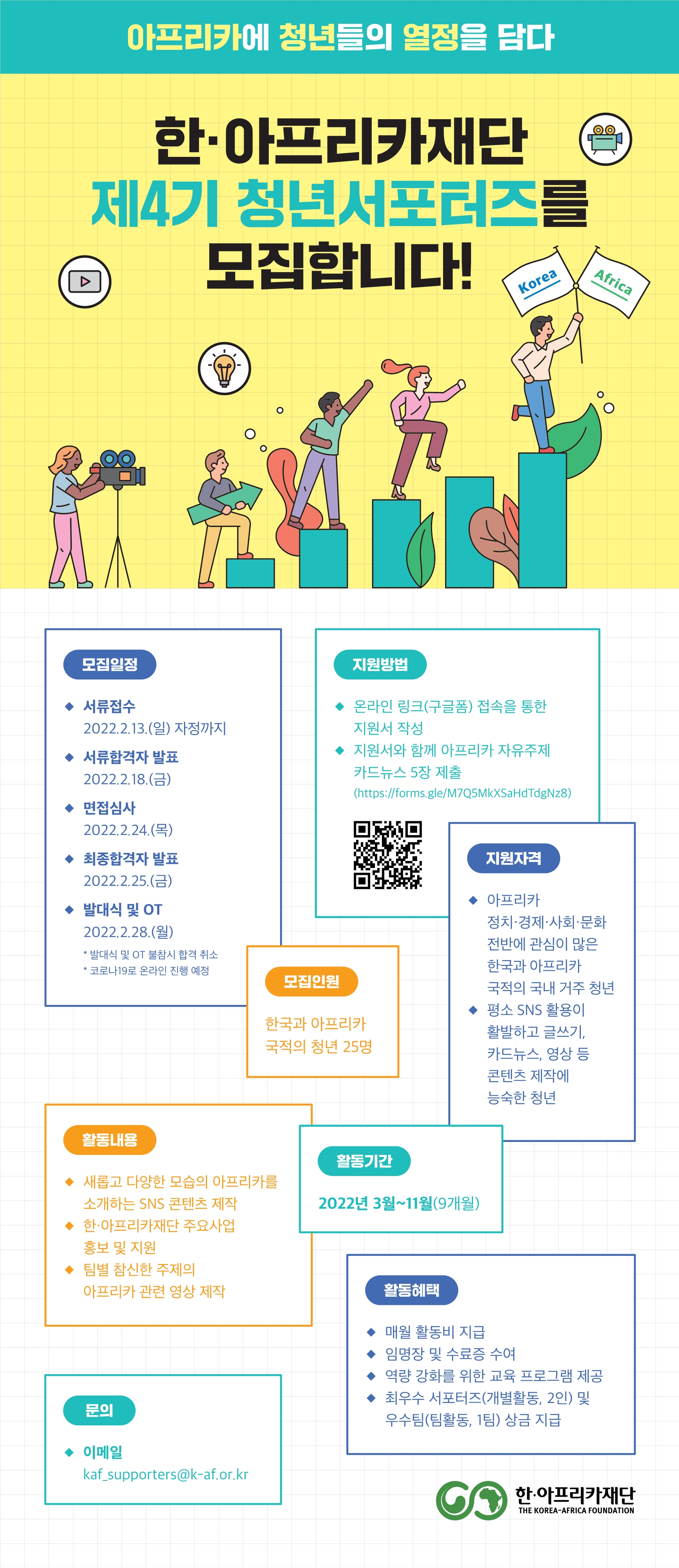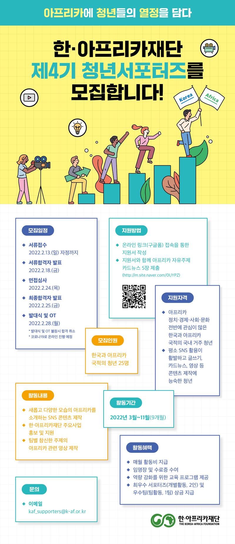 한·아프리카재단은 한국과 아프리카 청년들의 창의적인 시각으로 새롭고 다양한 아프리카를 알리기 위한 제4기 청년서포터즈를 모집합니다! 여러분의 많은 관심과 참여 부탁드립니다!