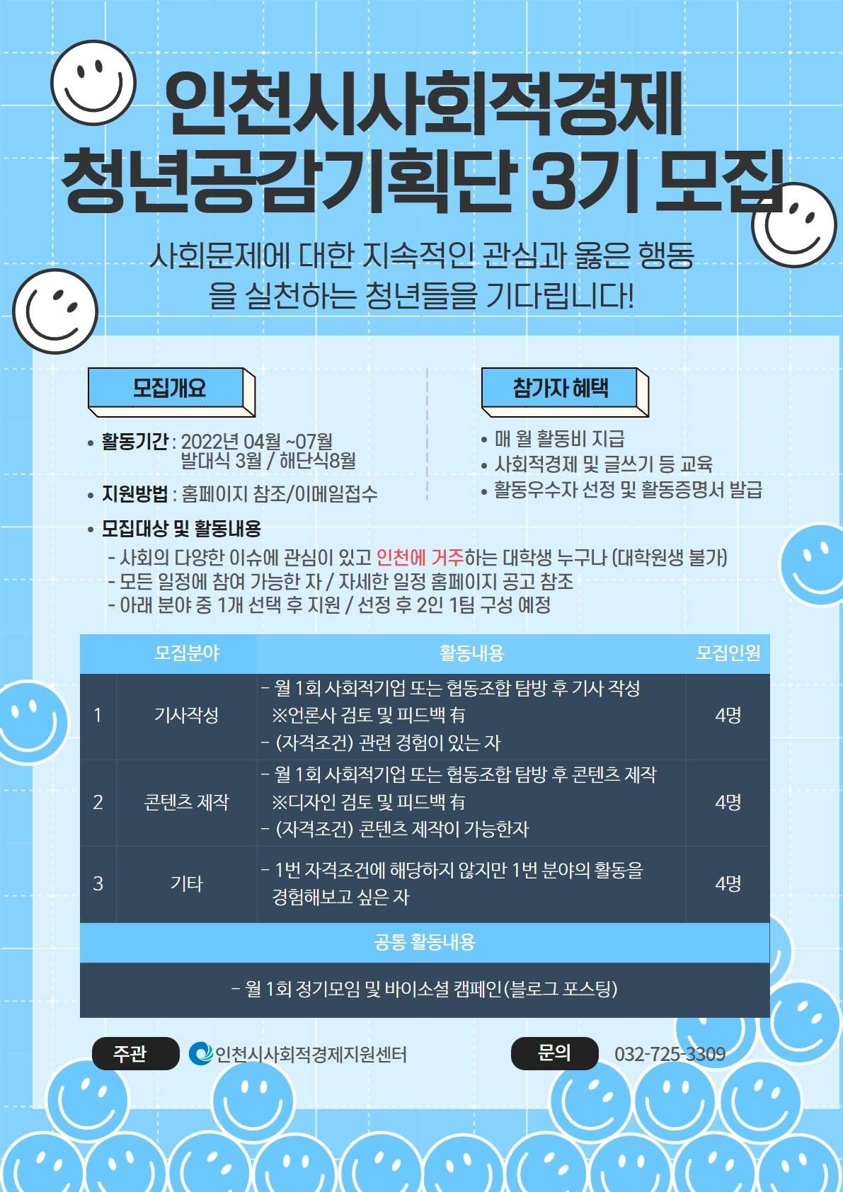 인천광역시 사회적경제지원센터는 사회적경제의 지속적인 성장을 위한 차세대 리더 육성을 위해 적극적이고 창의적인 청년들을 모시고자 아래와 같이 공고하오니 많은 관심과 지원 바랍니다.