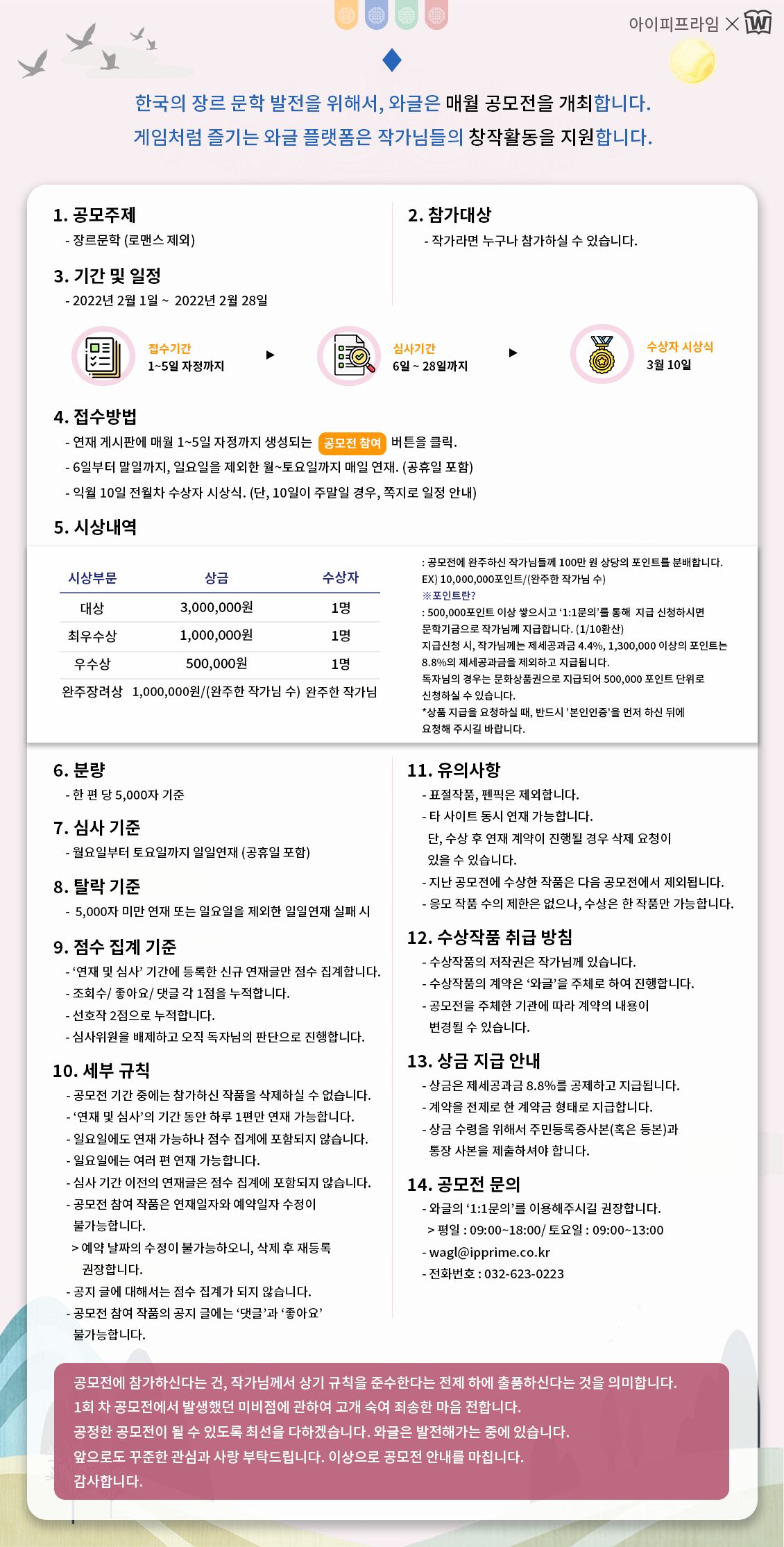 한국의 장르 문학 발전을 위해서, 와글은 매월 공모전을 개최합니다.