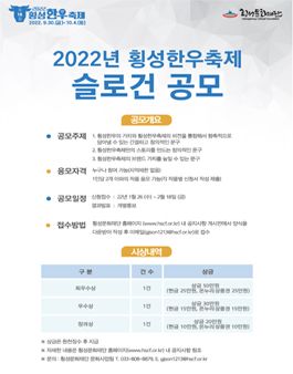 횡성한우의 가치와 횡성한우축제의 비전을 통합해서 함축적으로 담아낼 수 있는 간결하고 창의적인 슬로건 공모를 실시하오니 많은 분들의 관심과 참여 바랍니다.