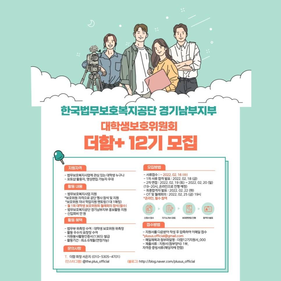 - 더 자세한 내용은 회원모집 및 활동포스터와 더함+ 대학생보호위원회 SNS를 확인하세요!