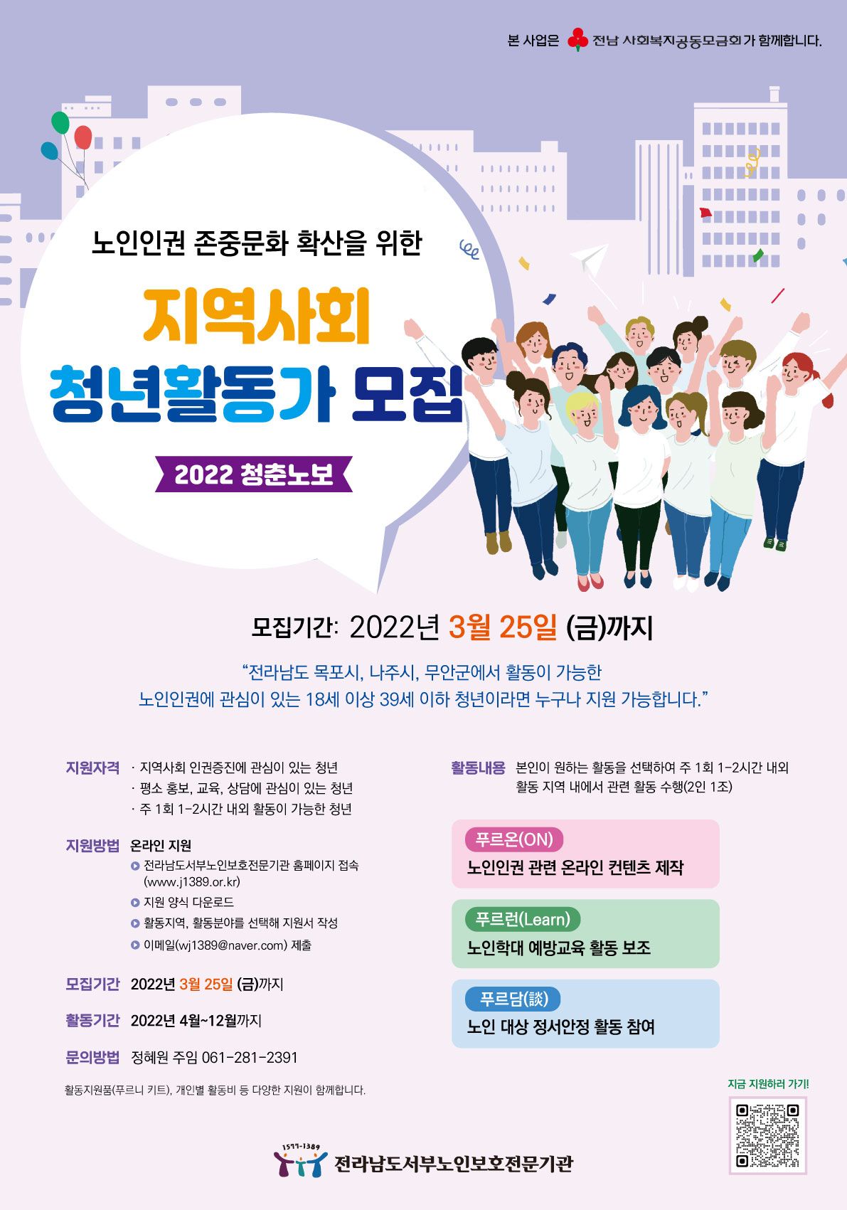 ○ 지원자격 : 전라남도 목포시, 나주시, 무안군에서 활동이 가능한 노인인권에 관심이 있는 18세 이상 39세 이하 청년이라면 누구나 지원 가능