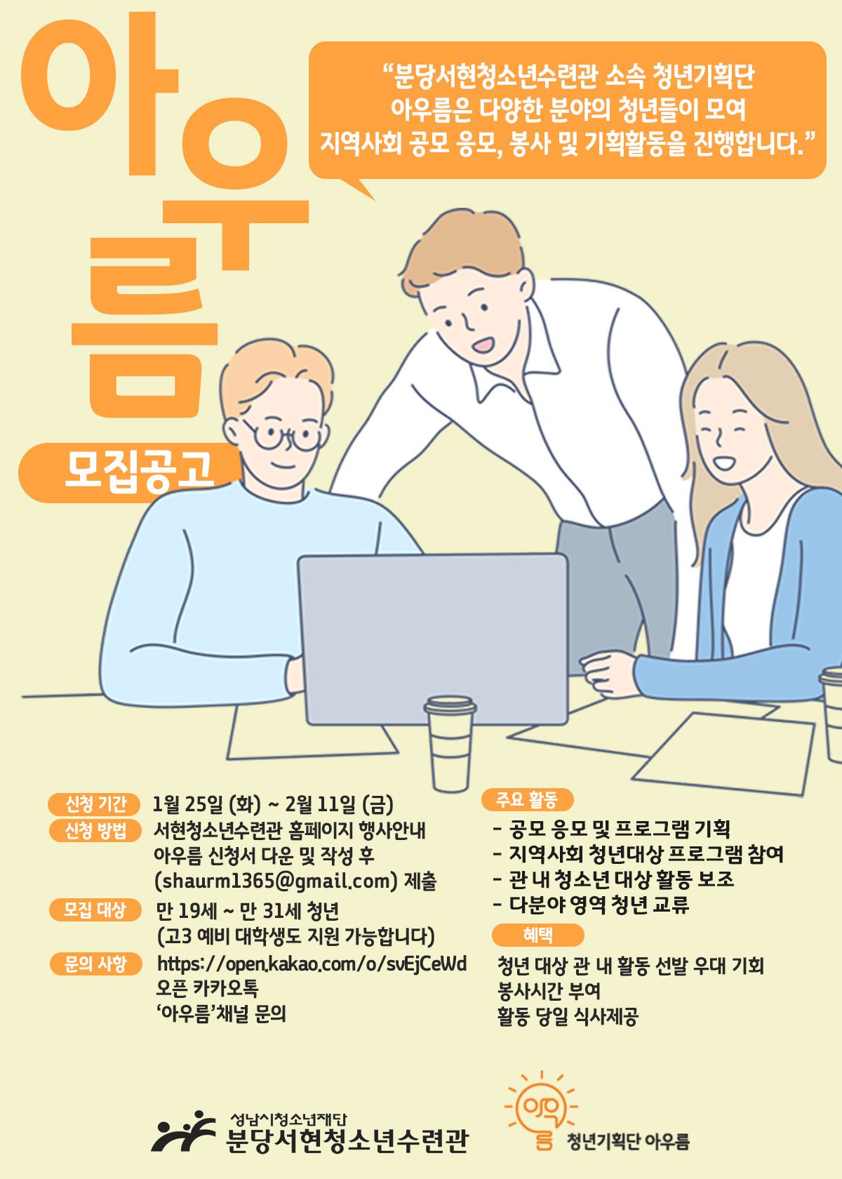 신청방법 -> 서현 청소년 수련관 홈페이지 -> 행사안내 -> 청년기획단 아우름 신규 단원 모집 공지 확인 -> 신청서 양식 다운 후 작성 -> shaurm1365@gmail.com 으로 발송