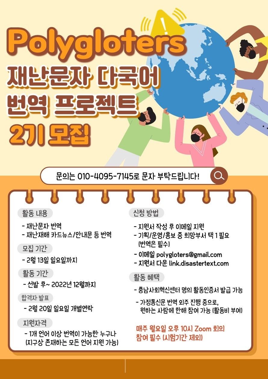 ☺재난문자 다국어 번역 프로젝트 '폴리글로터스'에서 함께 활동할 2기 신입 단원을 모집합니다☺