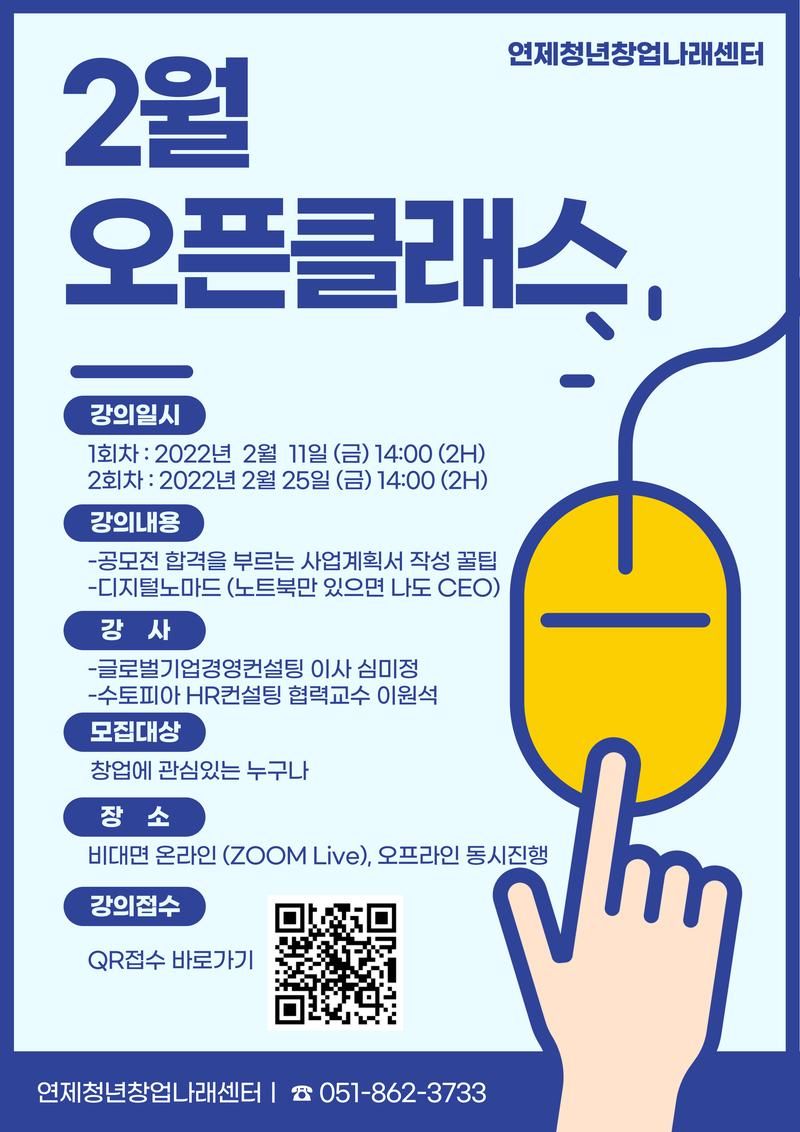 이번 2월 오픈클래스는 비대면 온라인(ZOOM Live)과 오프라인 동시 진행될 예정입니다.