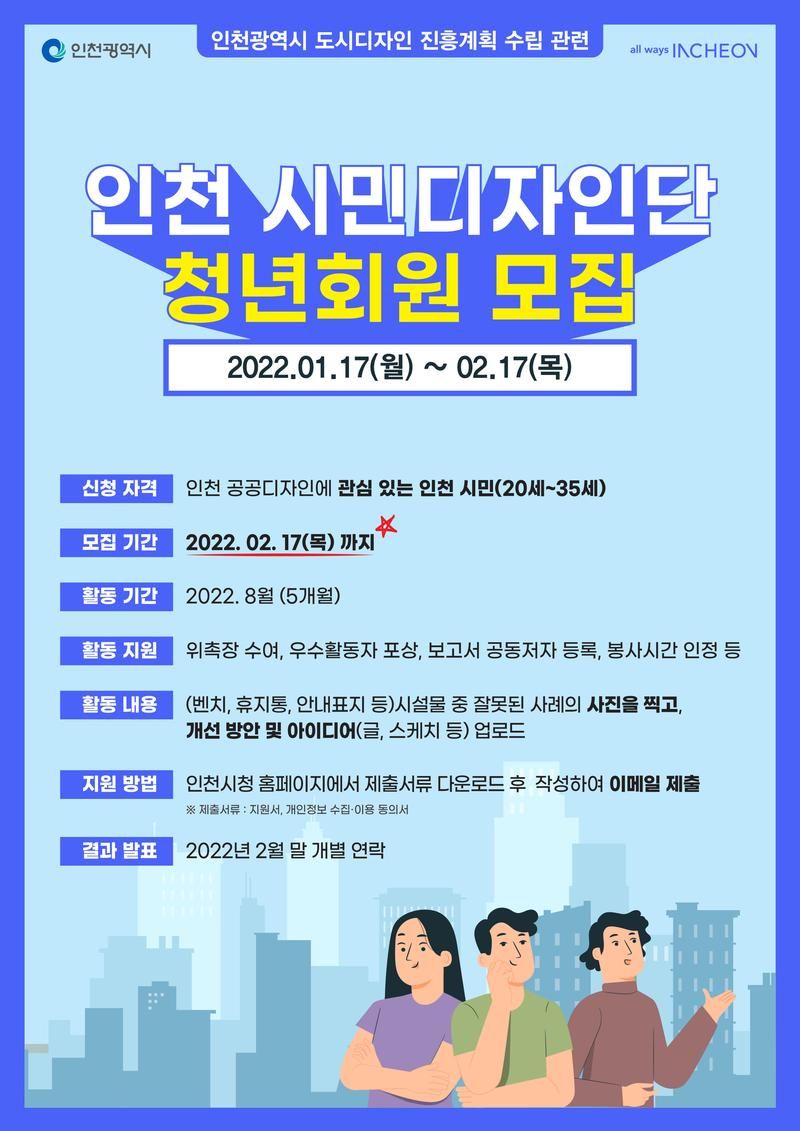 디자인으로 살기 좋은 인천을 만들기 위해 ‘인천 시민디자인단’청년회원을 모집합니다.