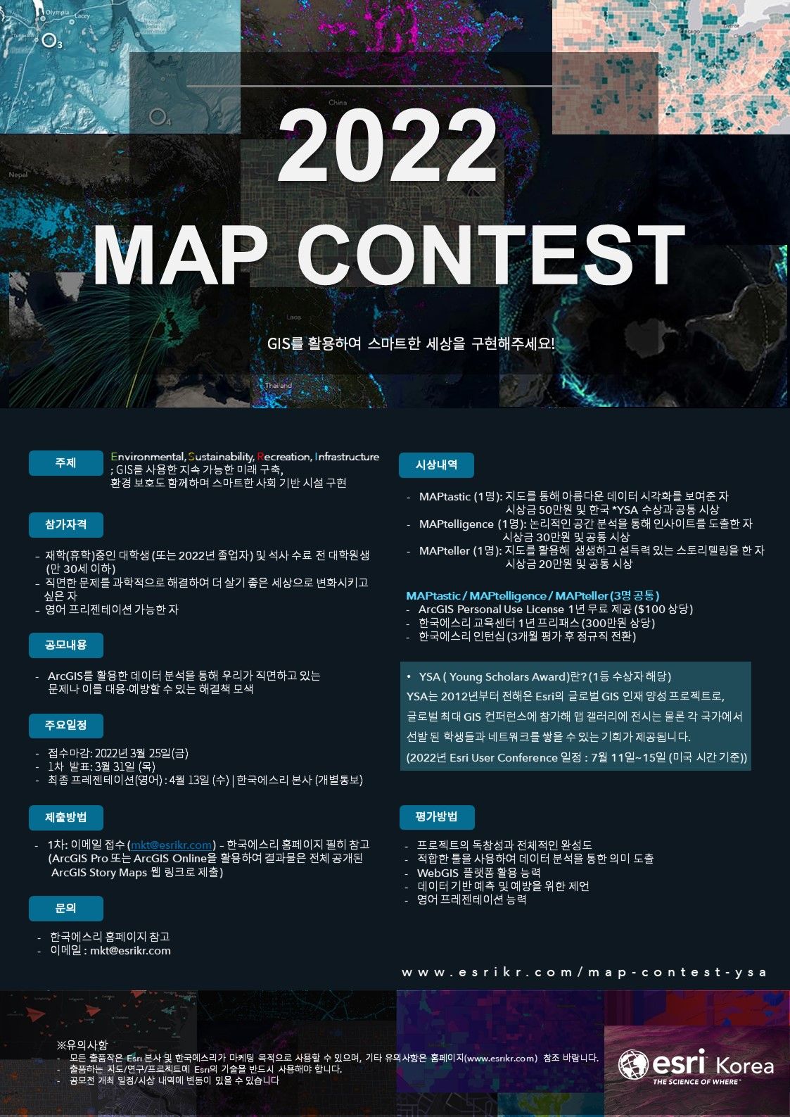 YSA는 2012년부터 전해온 Esri의 글로벌 GIS 인재 양성 프로젝트로, 글로벌 최대 GIS 컨퍼런스에 참가해 맵 갤러리에 전시는 물론 각 국가에서 선발 된 학생들과 네트워크를 쌓을 수 있는 기회가 제공됩니다. (자세한 사항은 아래 ‘ 공모전 상세 안내 다운받기’ 를 참고 바랍니다)