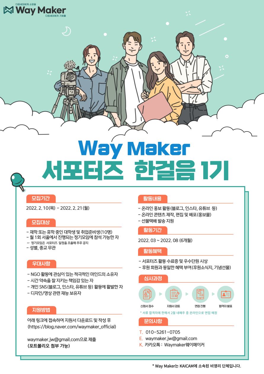 [한걸음 서포터즈]는 Way Maker의 다양한 온/오프라인 활동 및 영상/콘텐츠 기획, 제작, 홍보 등의 활동으로 나눔의 기쁨을 주변에 알리는 일을 함께 합니다. 많은 참여 부탁드립니다.