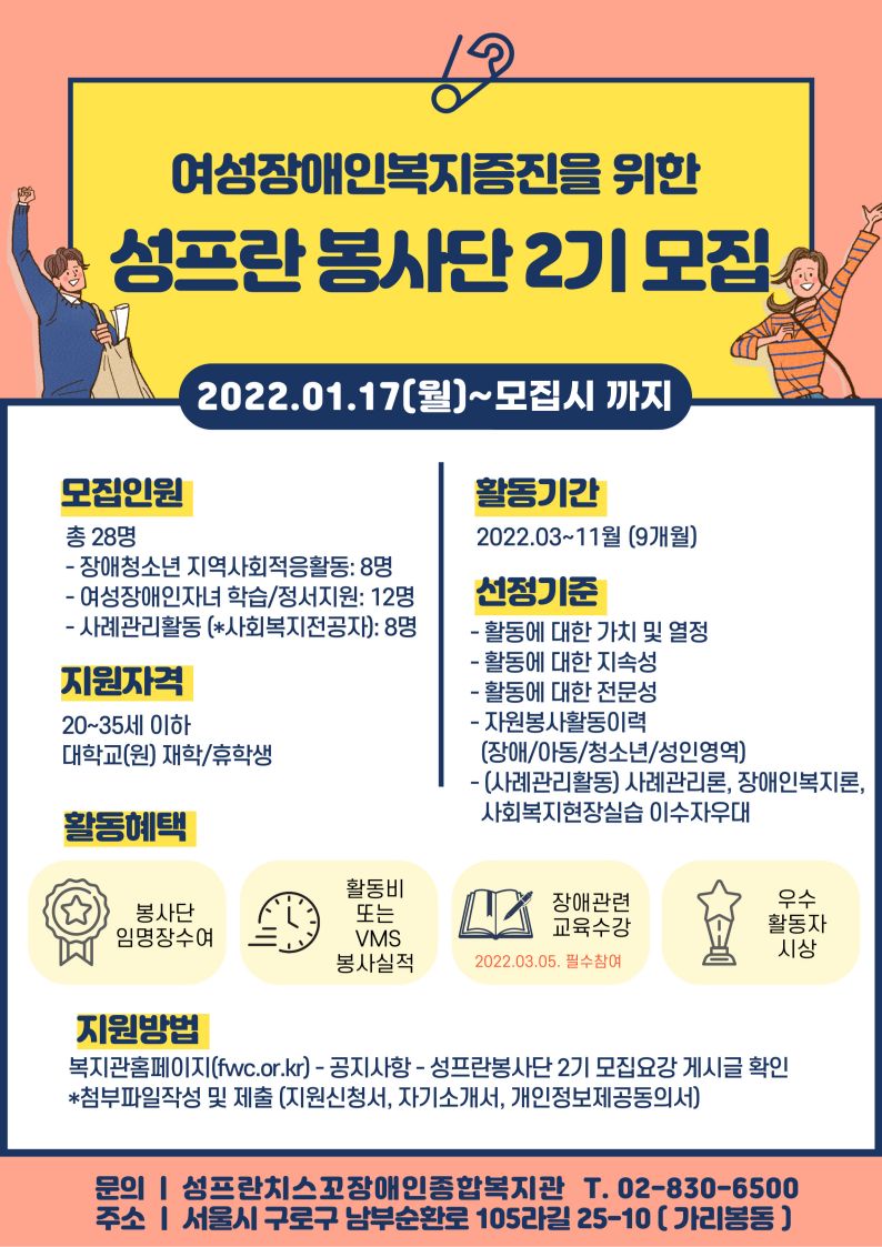 여성장애인복지증진을 위한 성프란봉사단 2기 모집