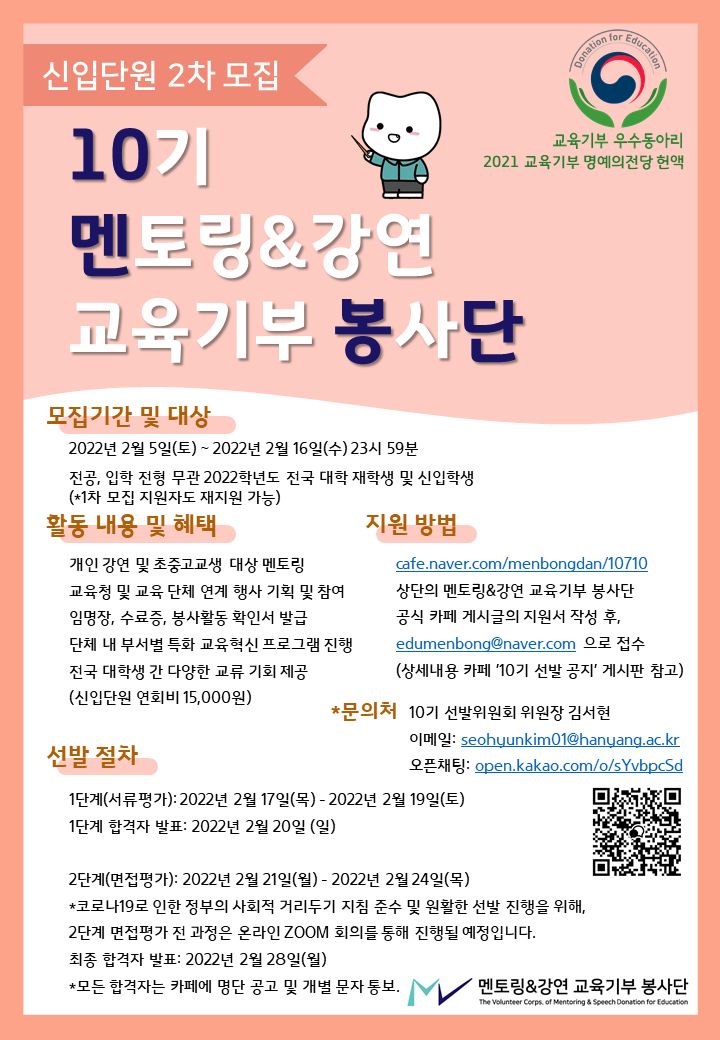 멘토링&강연 교육기부 봉사단(이하 멘봉단)은 교육불평등 해소라는 이념으로 만들어진 전국 대학생들의 대외활동 연합동아리로, 현재 전국 대학 예비 22학번 및 재학생(휴학생 포함)을 대상으로 10기 2차 신입단원을 모집중에 있습니다😁