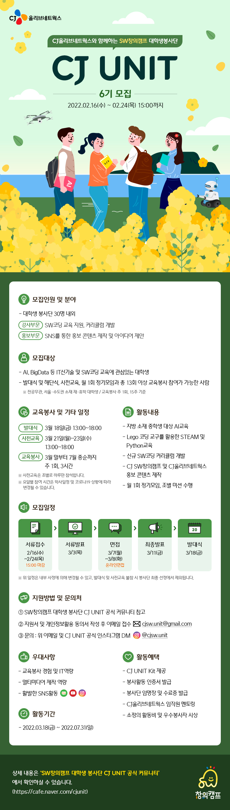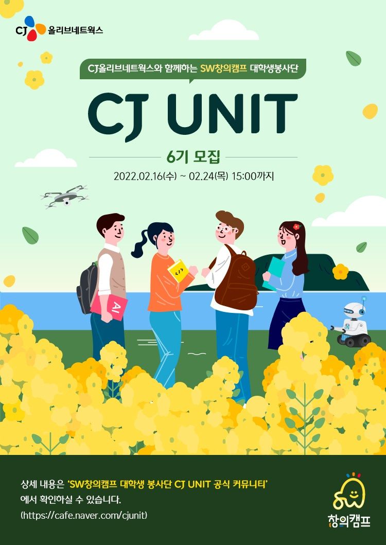 현존하는 최고의 대학생 대외활동 프로그램, SW창의캠프 대학생봉사단 CJ UNIT 6기를 아래와 같이 모집합니다.