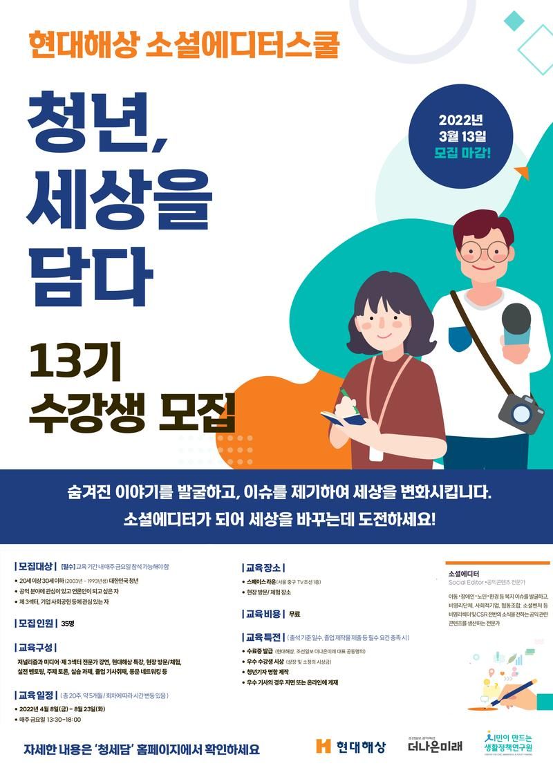 현대해상과 조선일보 더나은미래, 시민이 만드는 생활정책연구원은 공익분야 콘텐츠 전문 소셜에디터(Social Editor) 양성 프로그램인 ‘청세담 13기’ 수강생을 모집합니다.