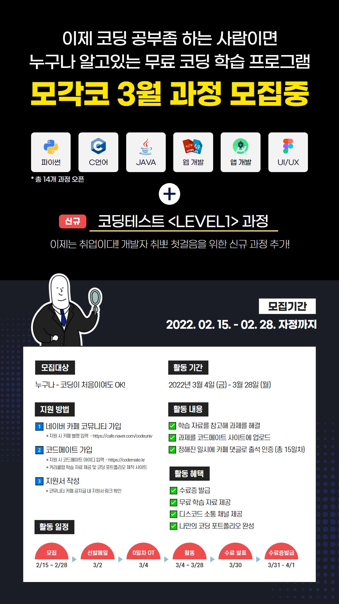 - 모집 : 22. 2. 15. (화) ~ 22. 2. 28. (월) 자정