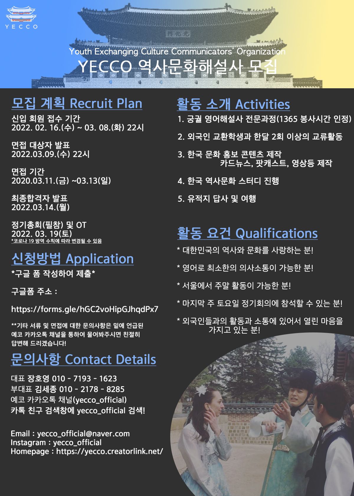 💙💛안녕하세요! 우리의 문화와 역사를 외국인에게 알리며 문화 교류를 꿈꾸는 단체 YECCO에서 신입 7기 회원을 모집합니다!💛💙 저희와 함께 즐겁게 활동할 새로운 회원을 열린 마음으로 맞이하고 있습니다. 한국 역사 문화와 교류에 열정과 관심만 있다면 누구나 YECCO의 일원으로 뜻깊은 활동들을 즐길 수 있습니다.