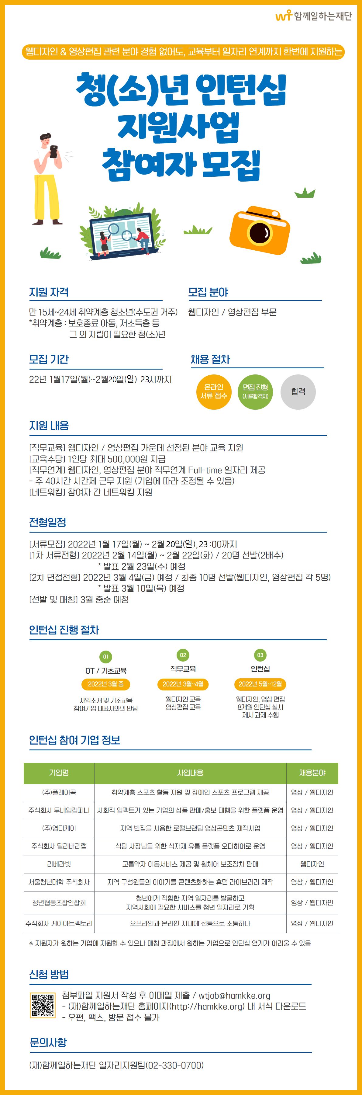 - 직무연계; 웹디자인, 영상편집 분야 직무연계 Full-time 일자리 제공/ 주 40시간 시간제 근무 지원(기업에 따라 조정될 수 있음)